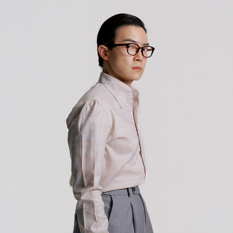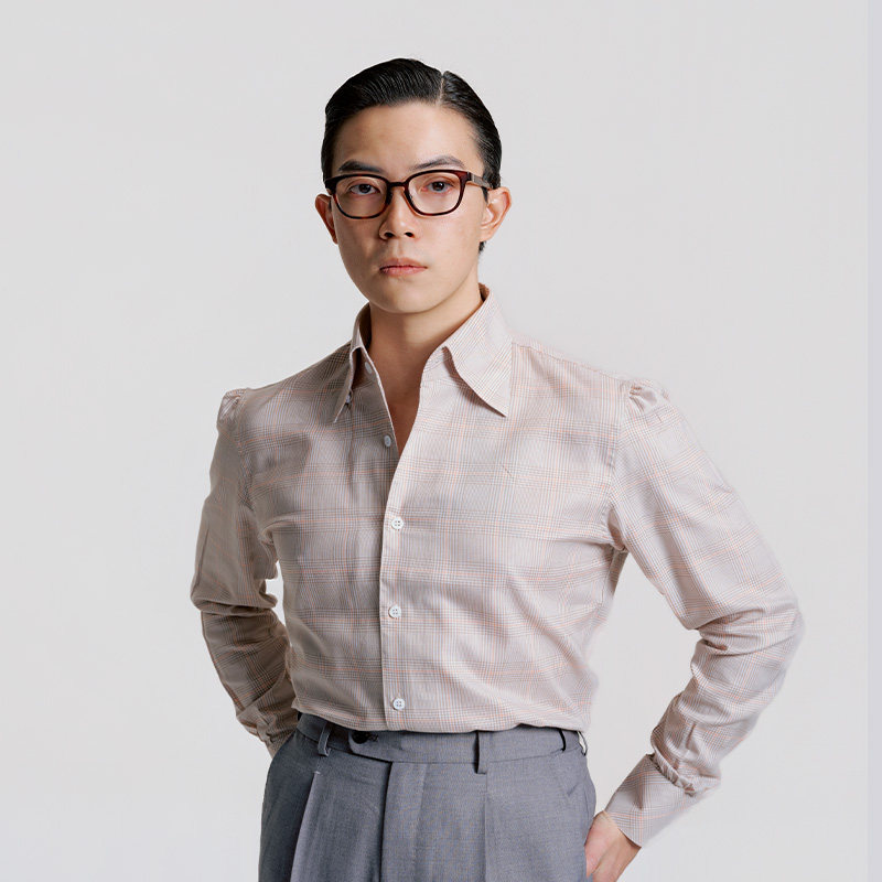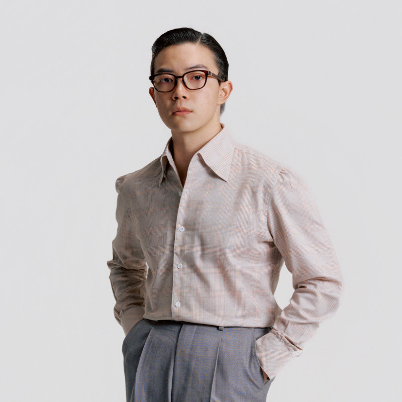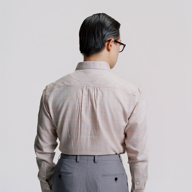 平圆方中格子一片领长袖衬衫男