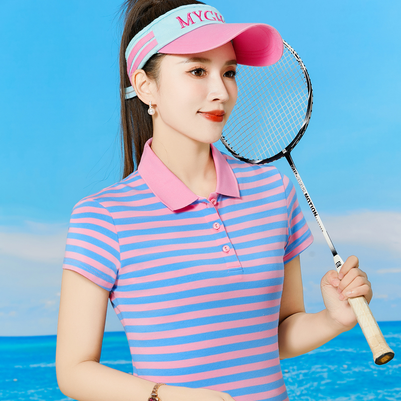 短袖t恤女条纹百搭运动上衣夏季POLO领体恤翻领polo衫女中年女装