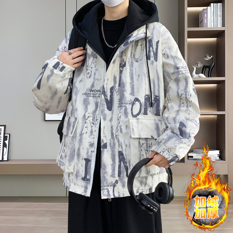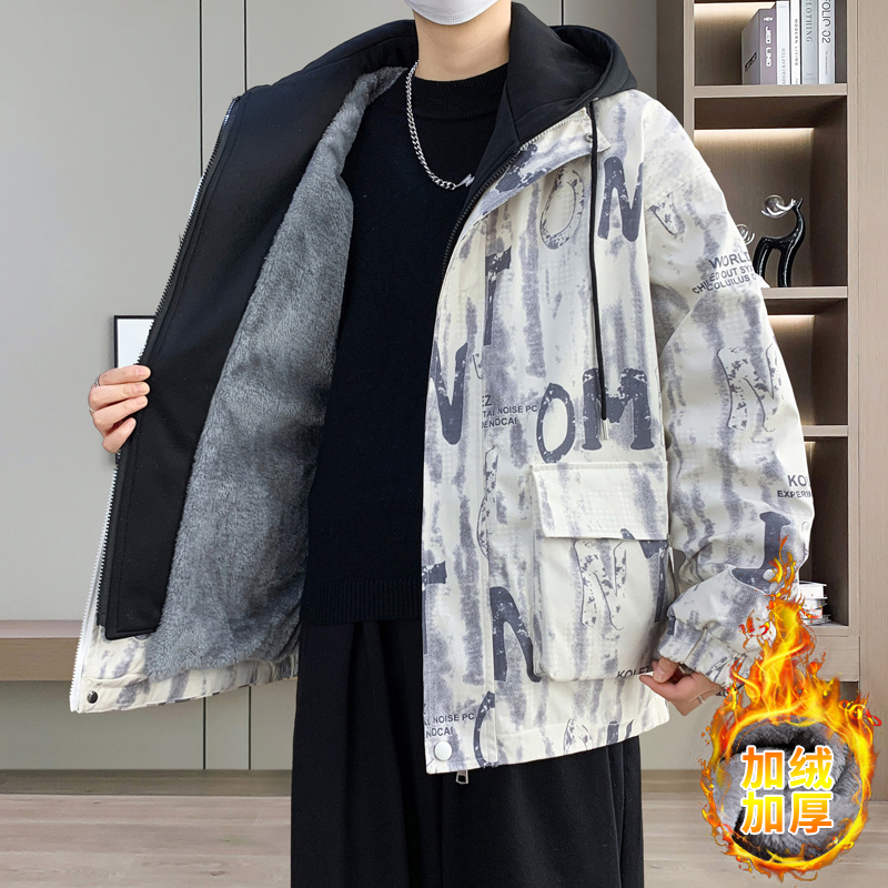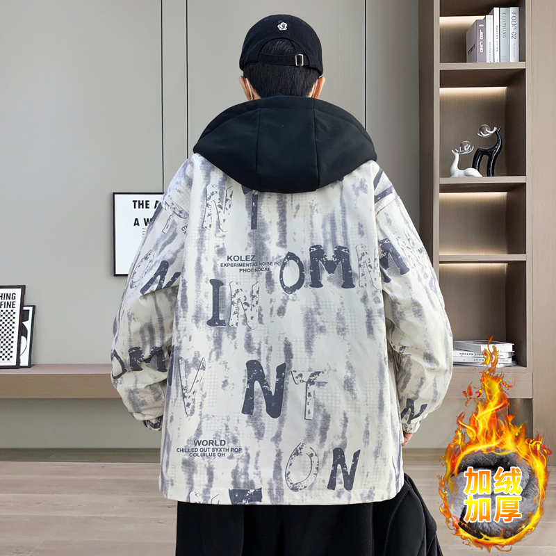 假两件连帽外套冬季加绒加厚夹克冬装潮牌工装印花棉衣服男款以純