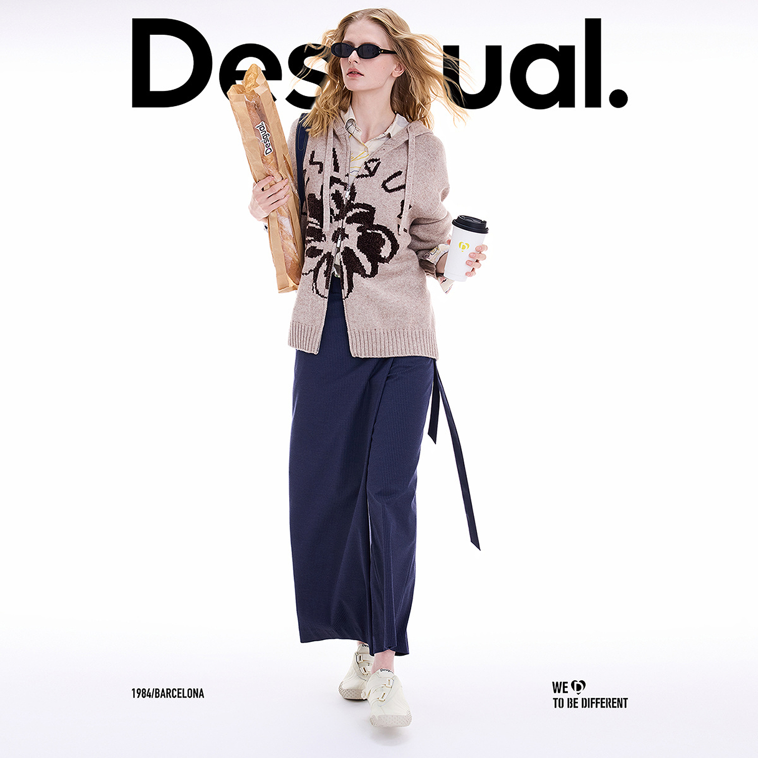 Desigual25秋冬新品羊毛混纺雪尼尔撞色提花针织连帽开衫女士外套
