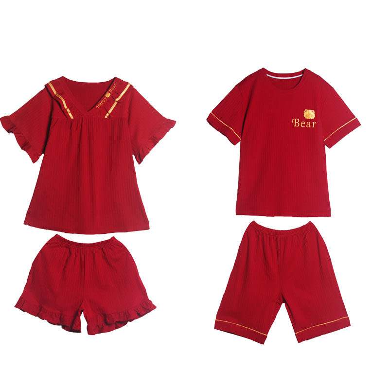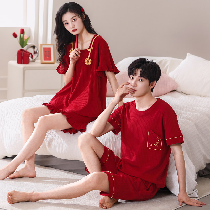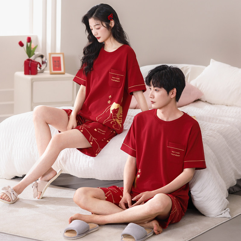 浪莎情侣睡衣夏季纯棉短袖短裤红色本命年韩范家居服结婚套装2025