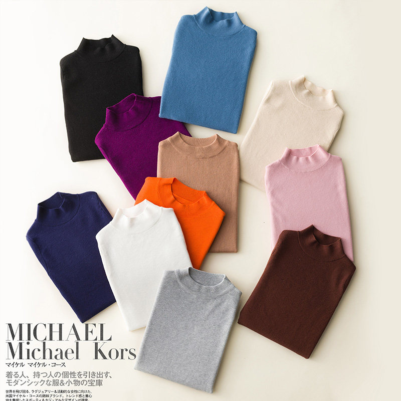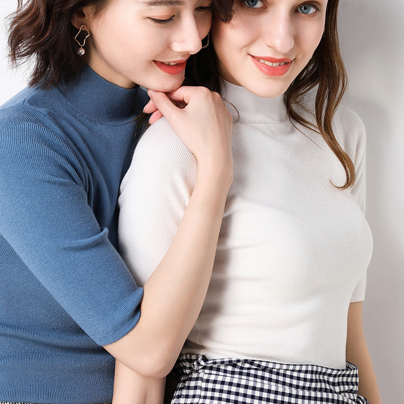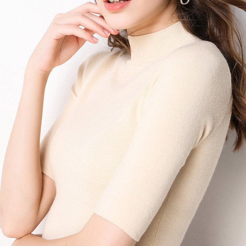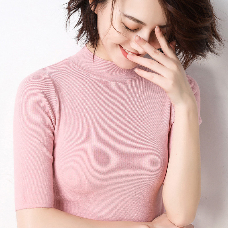 秋款半高领冰丝针织衫短袖修身薄款套头五分袖打底衫毛衣女半袖