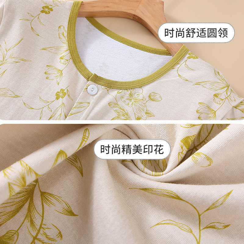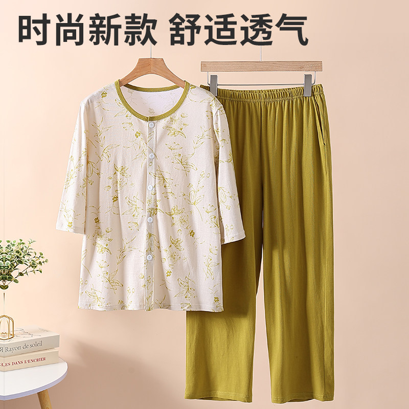 中老年纯棉七分袖睡衣套装女夏季开衫上衣妈妈宽松大码睡裤家居服