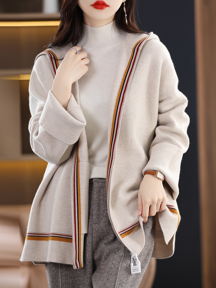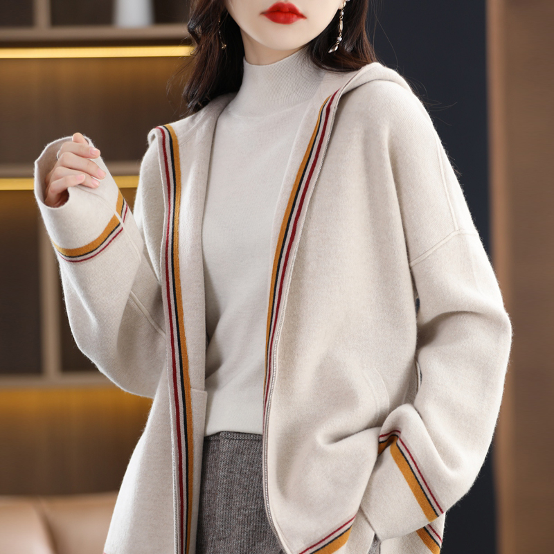 100%纯羊毛开衫女秋冬新款连帽针织大衣宽松慵懒风拼色羊绒衫外套