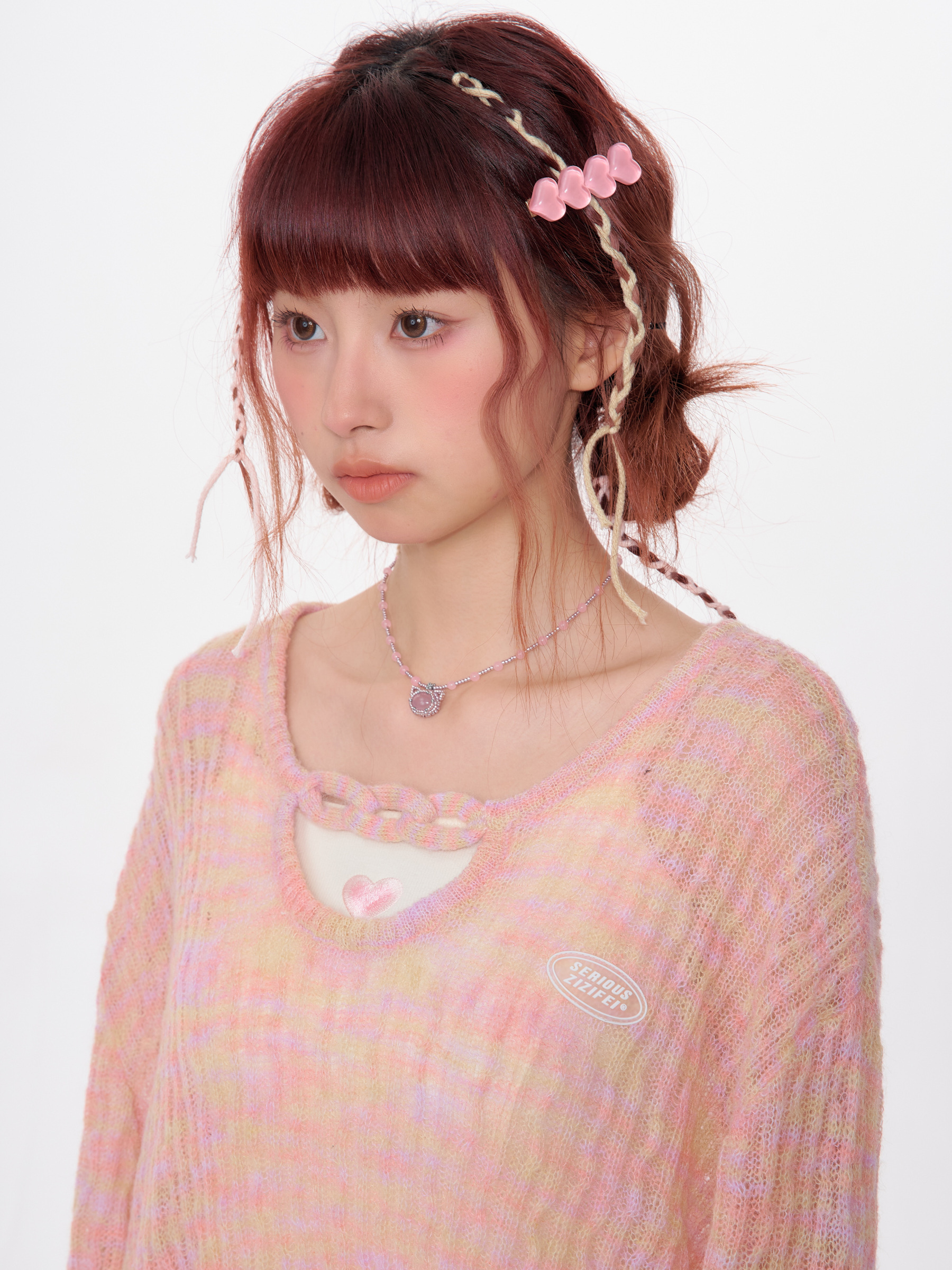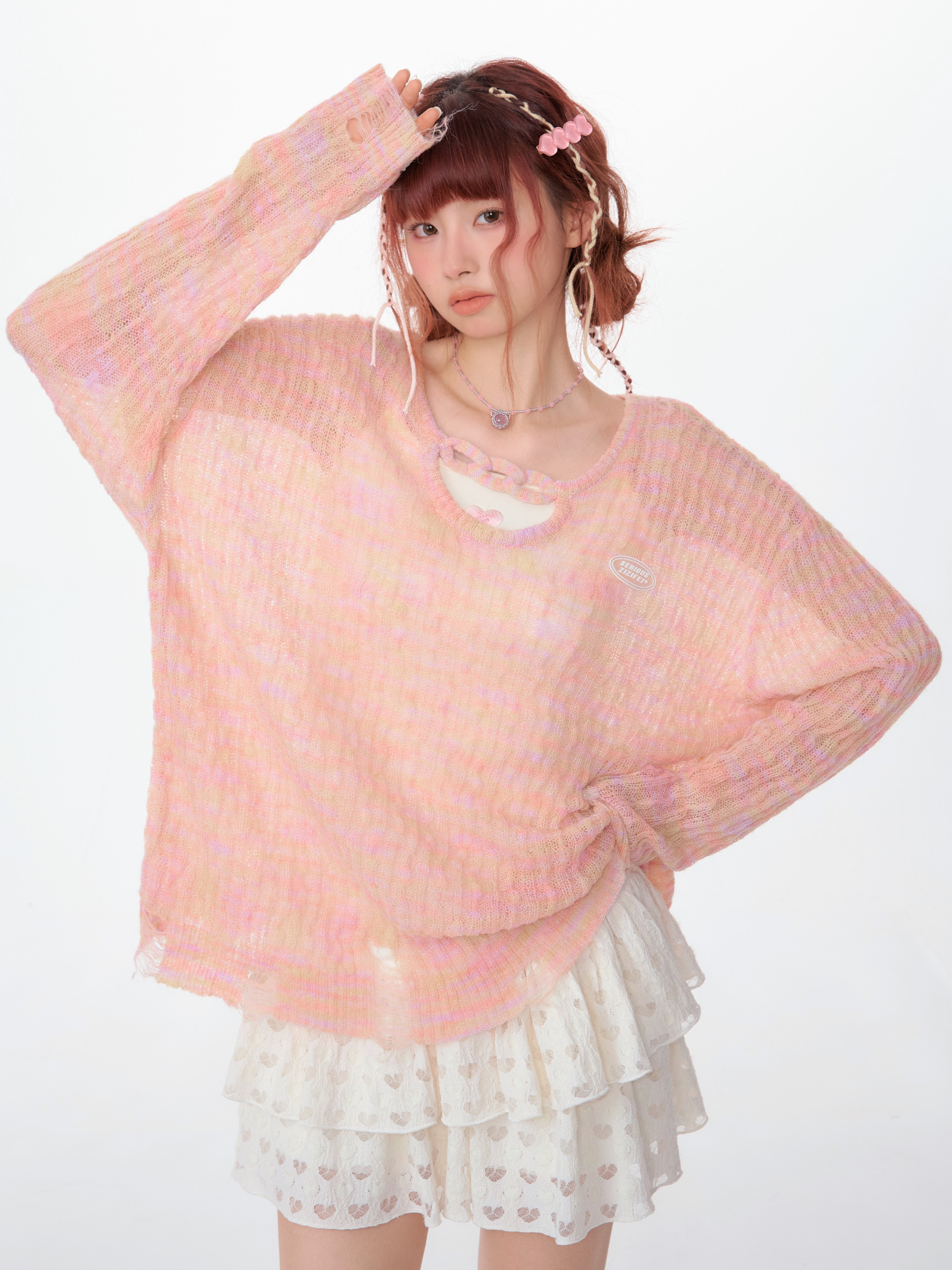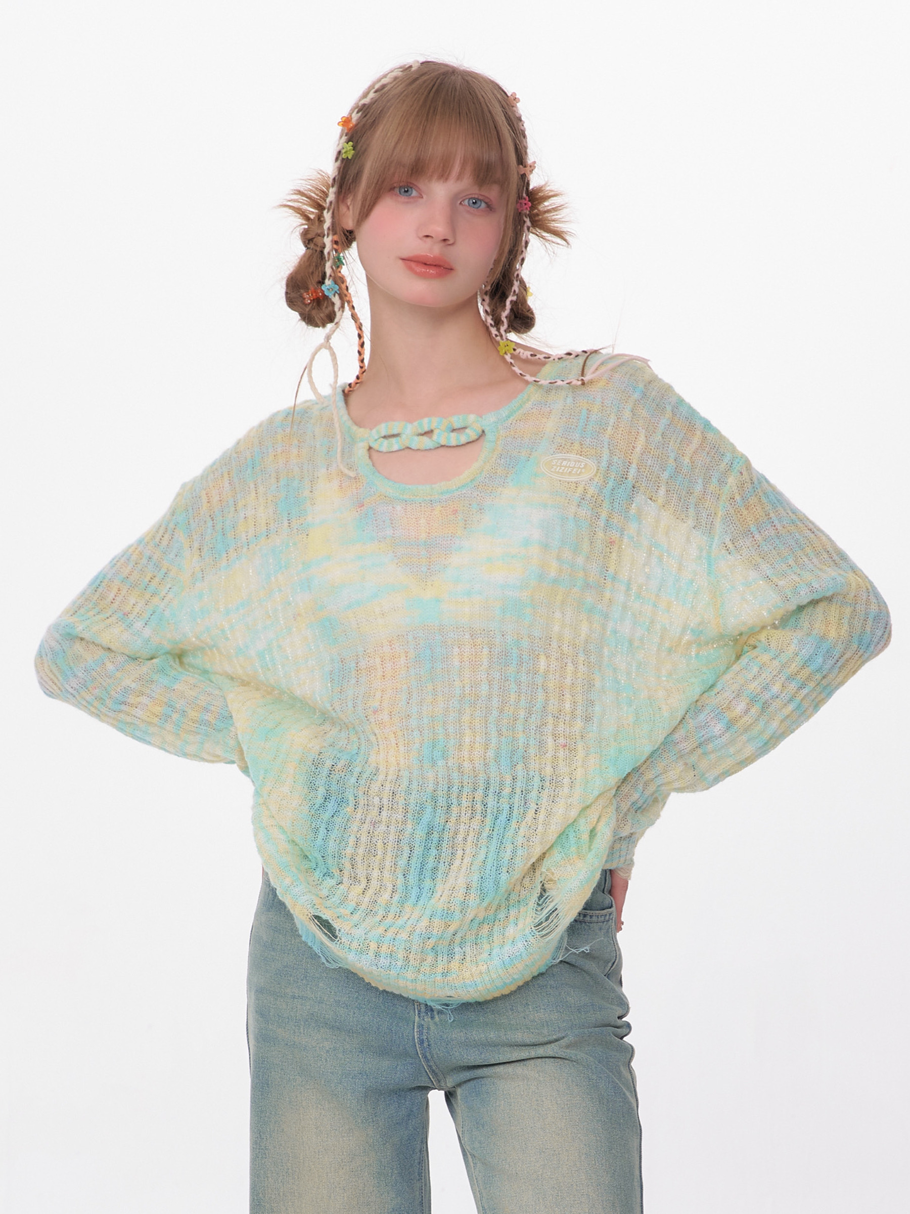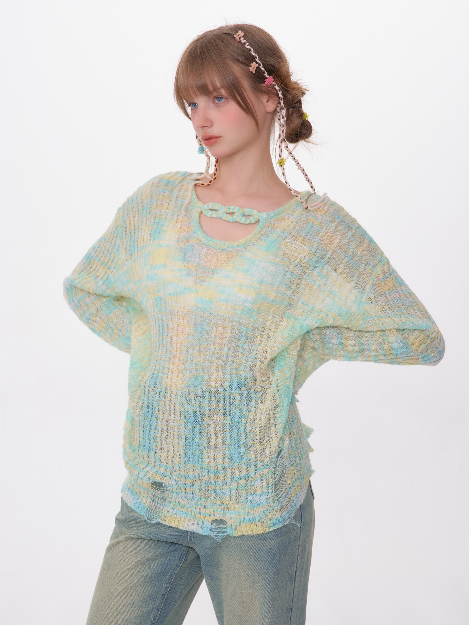 小u领渐变纱线破边复古长袖罩衫