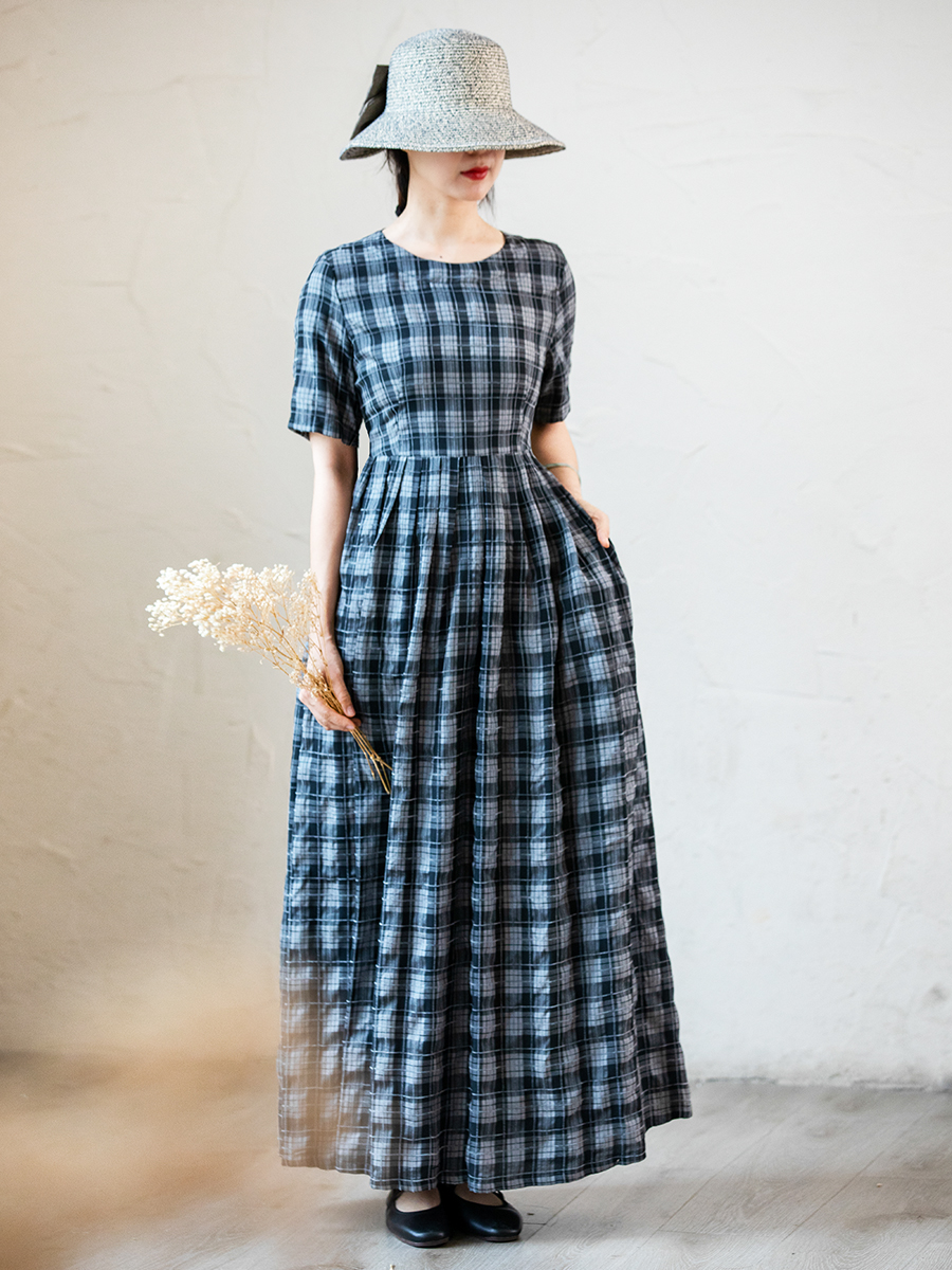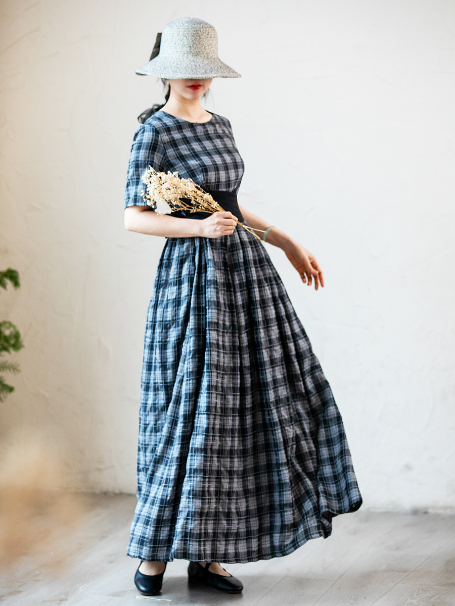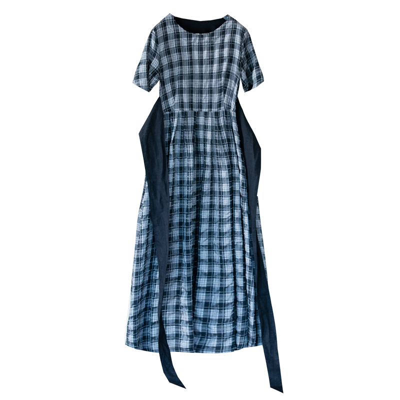 仙衣裾原创设计师圆领格子连衣裙A字大摆文艺气质收腰复古长裙夏