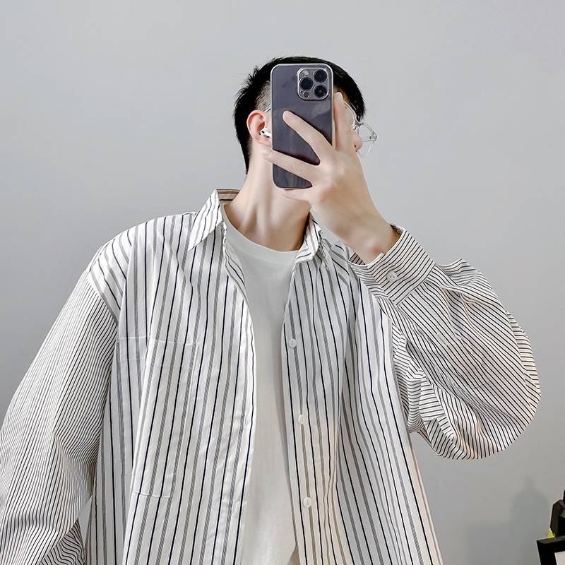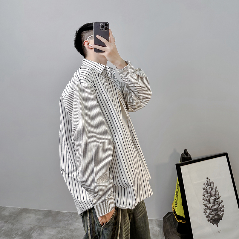 PGUP春季新品袖子拼接条纹长袖衬衫男细条纹基础款宽松百搭衬衣潮