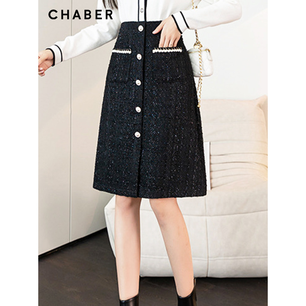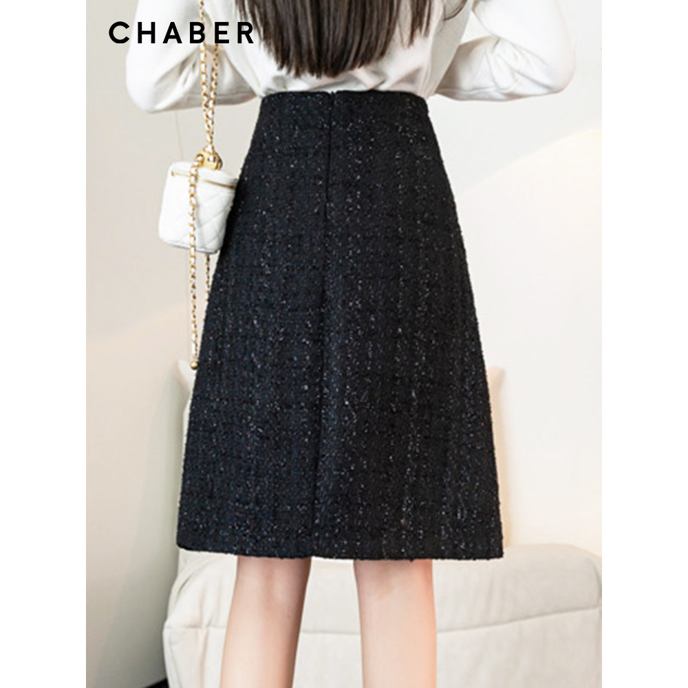 chaber巧帛秋季新品气质优雅A字裙子高腰显瘦粗花呢通勤半身裙