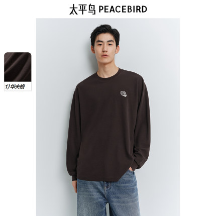 太平鸟男装华夫格长袖T恤春秋圆领刺绣打底衫时尚宽松体恤纯色T