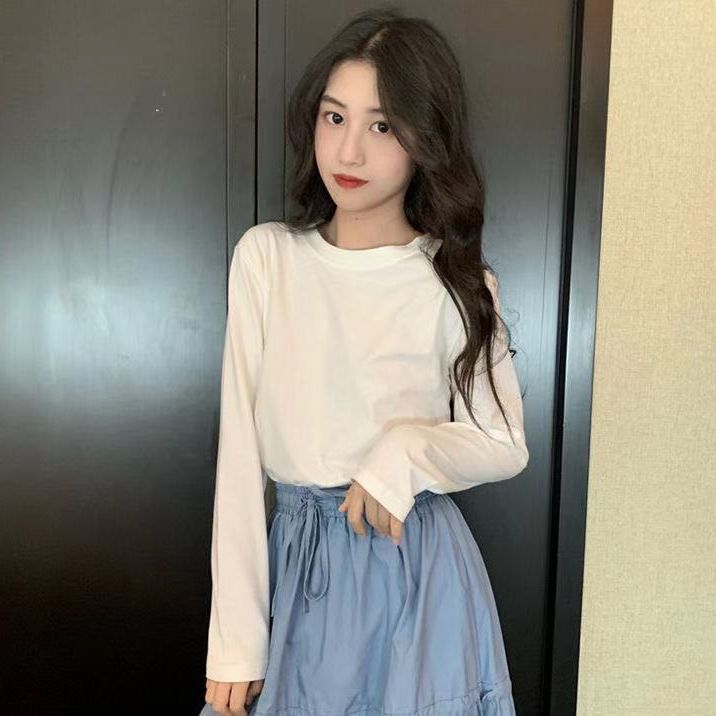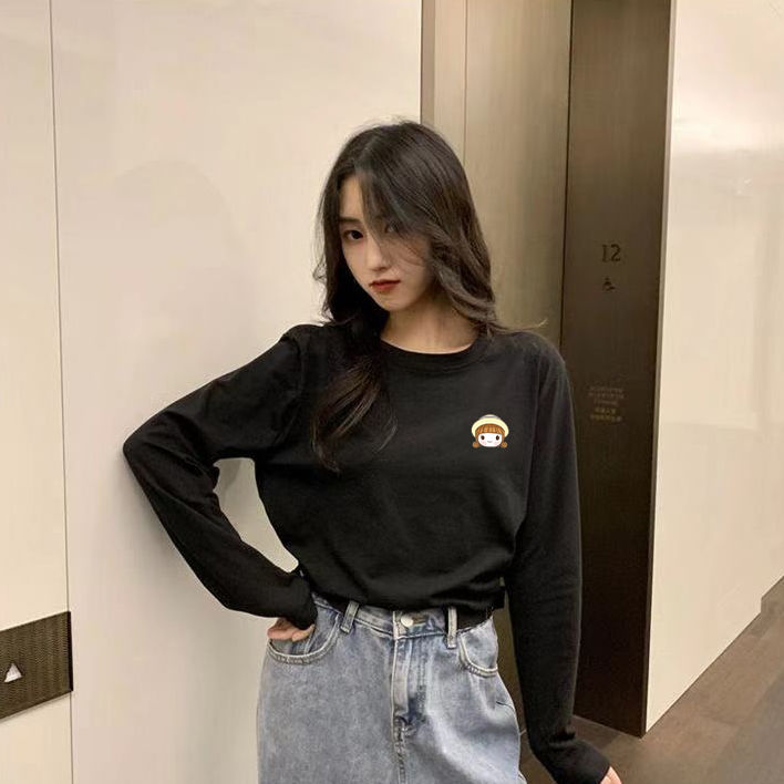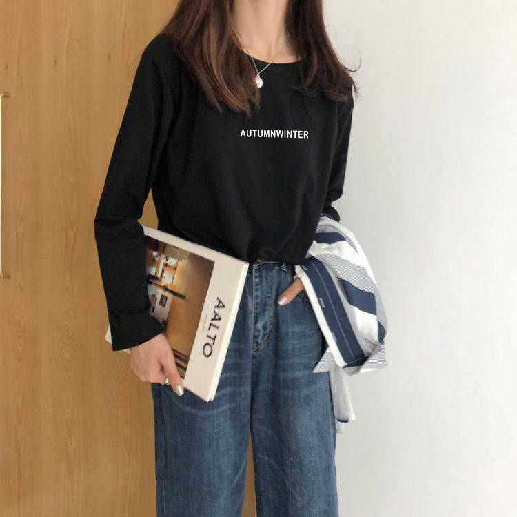白色打底衫女长袖t恤内搭宽松2024新款春秋百搭短款黑色印花上衣