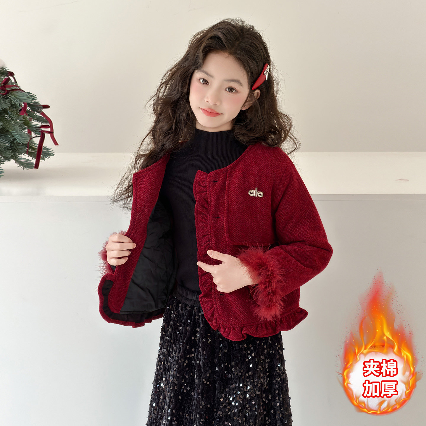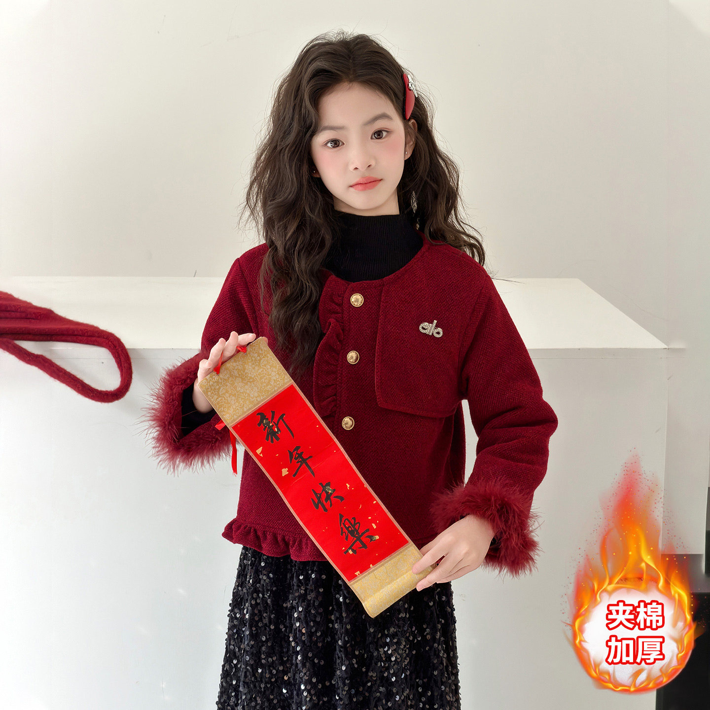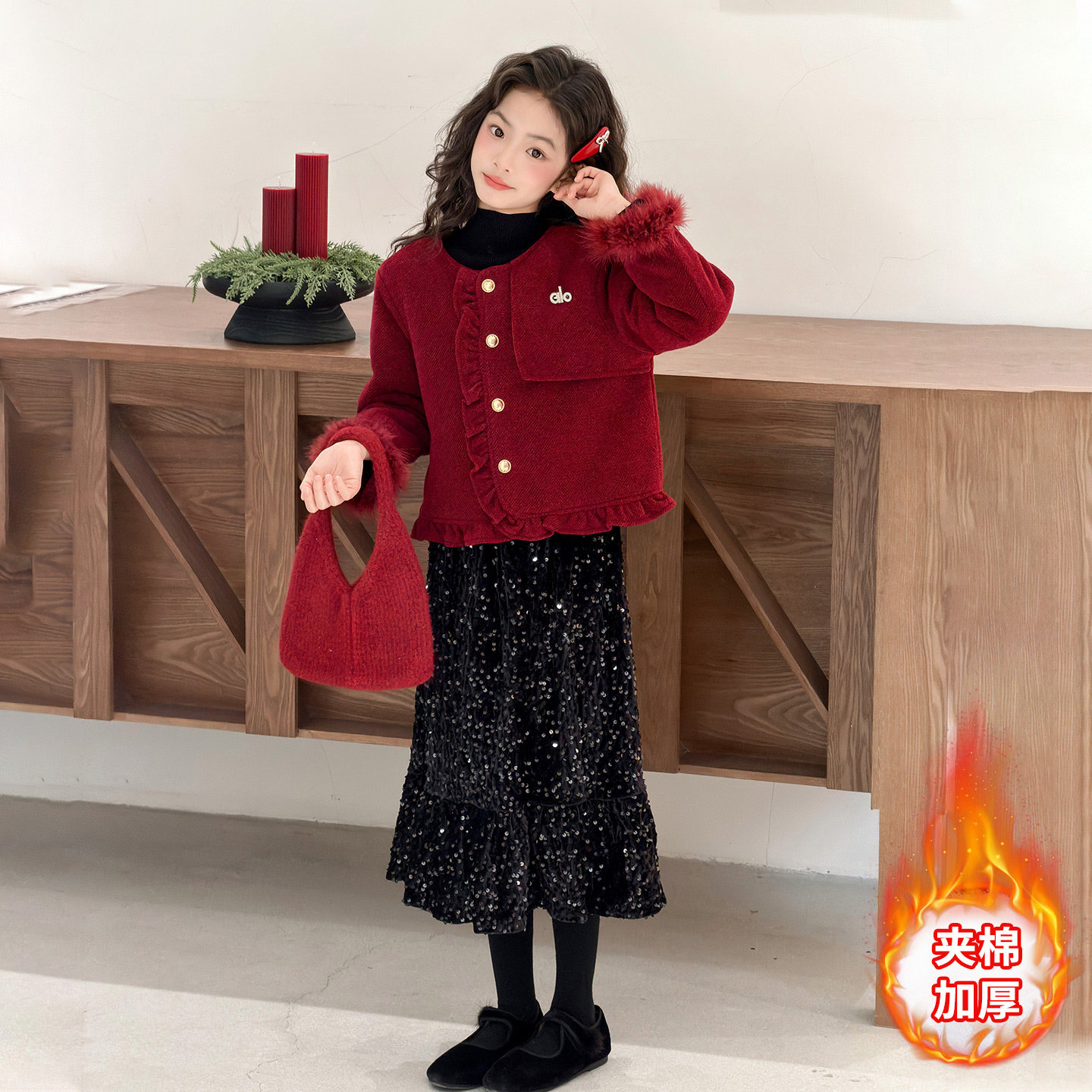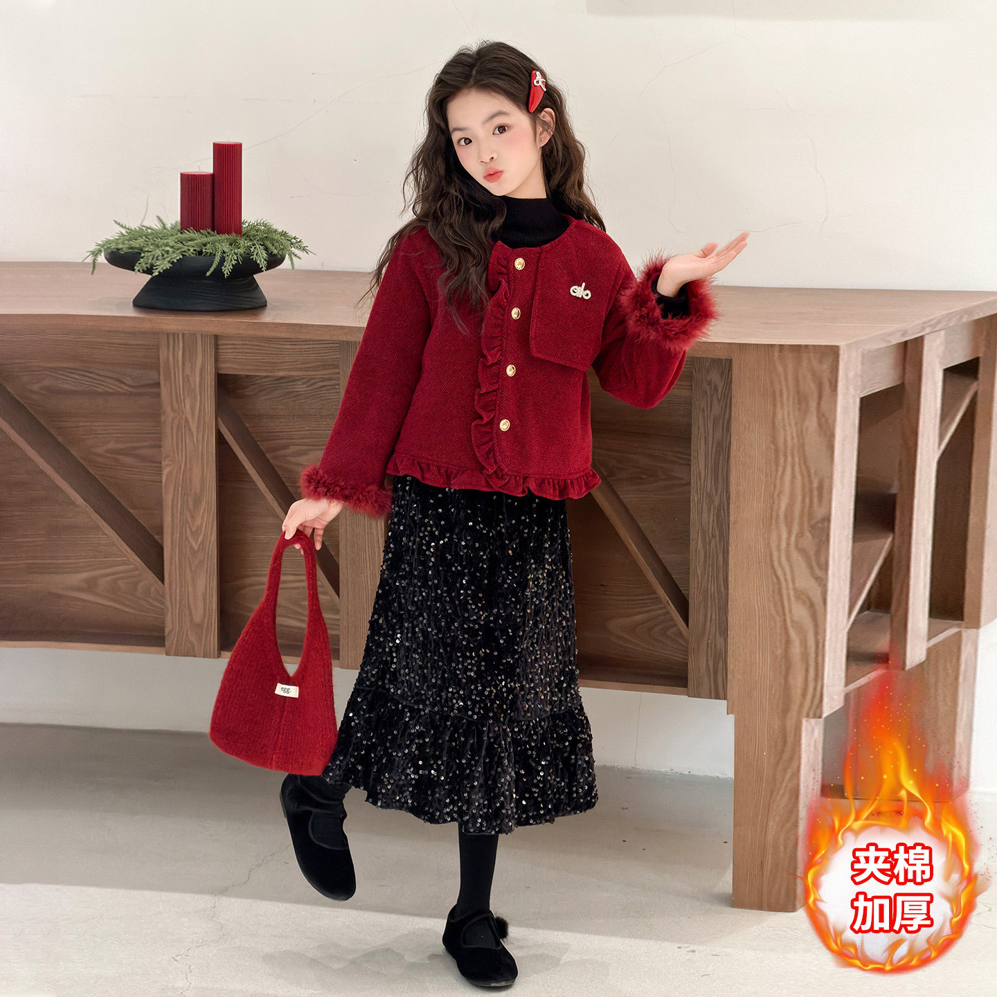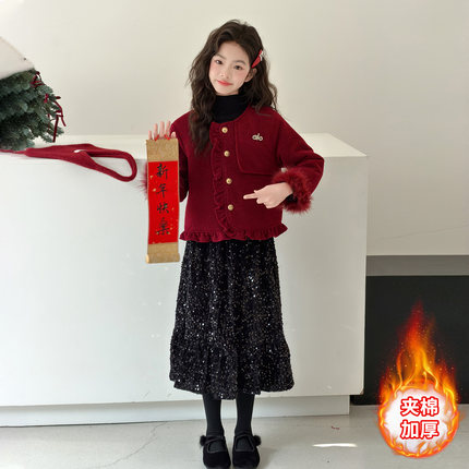女童新年套装裙2026秋冬新款女大童小香风红色外套儿童加厚亮片裙