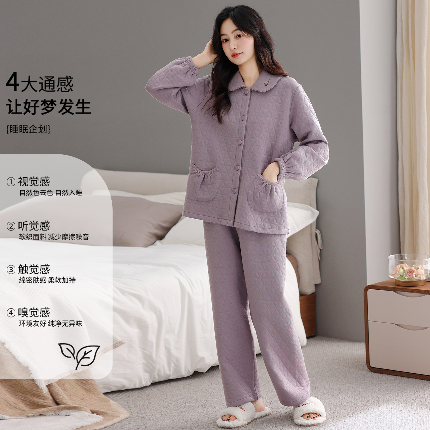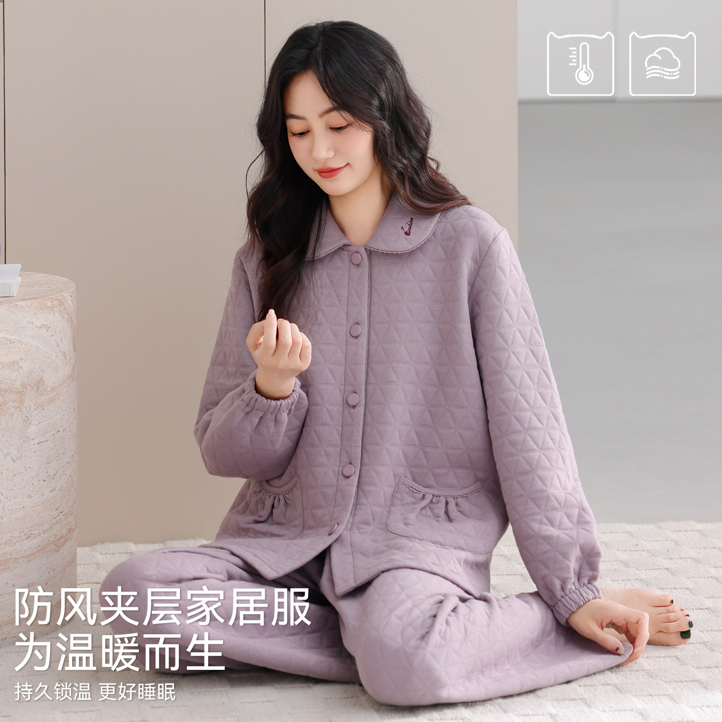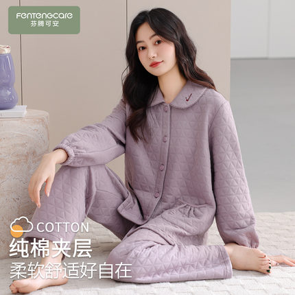 芬腾可安睡衣秋女款2026新款冬季纯棉夹层空气棉加厚大码紫家居服