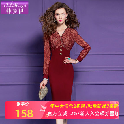 菲梦伊红色钉珠连衣裙女长袖秋装新款气质女神范名媛修身拼接裙子