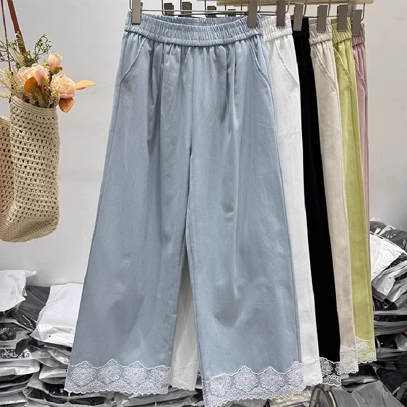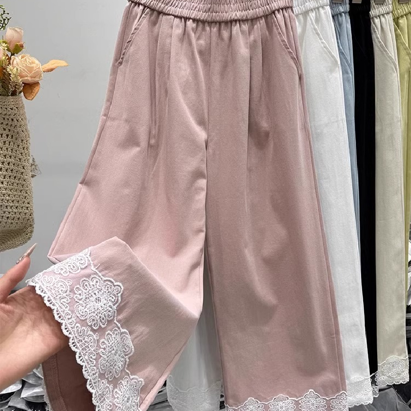 胖妹妹大码200斤蕾丝花边阔腿裤女春夏季松紧高腰减龄休闲九分裤