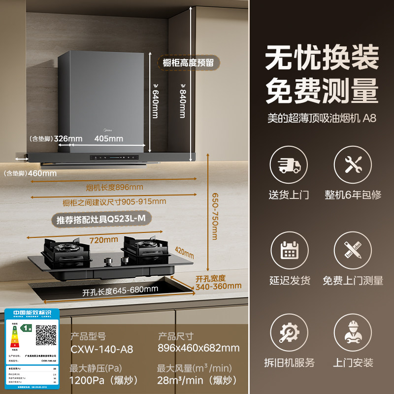美的A8油烟机厨房家用新欧式顶吸超薄大吸力变频套装官方旗舰店