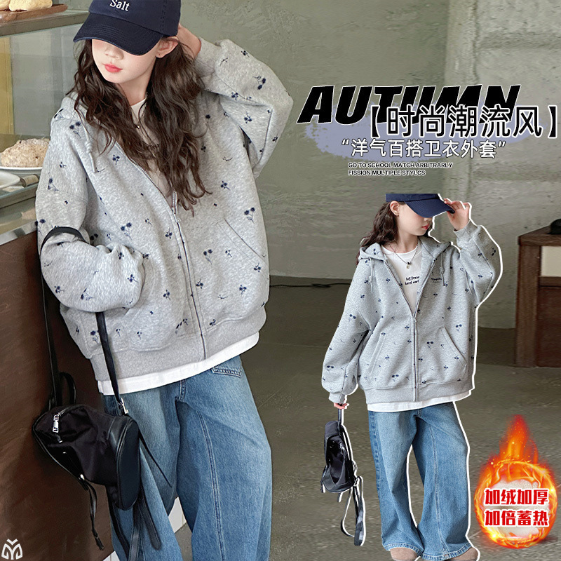 女童加绒外套2025新款韩系兰花连帽拉链卫衣大童学生秋冬休闲