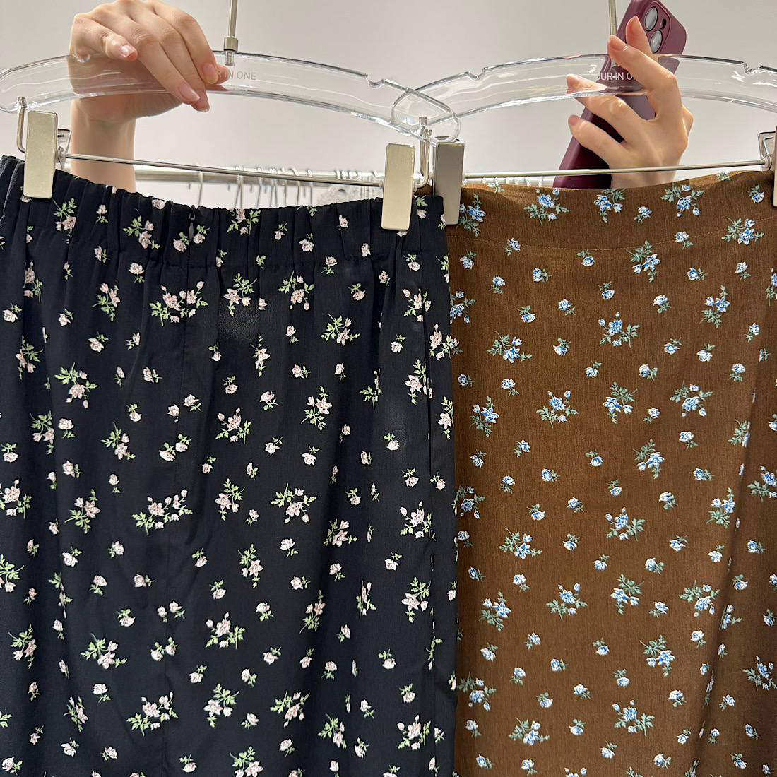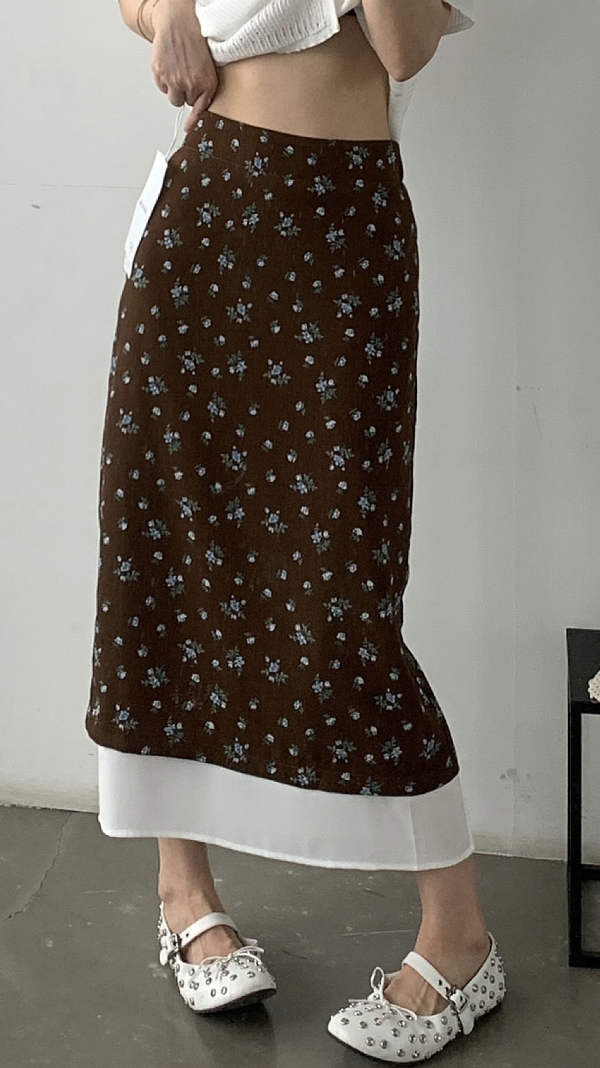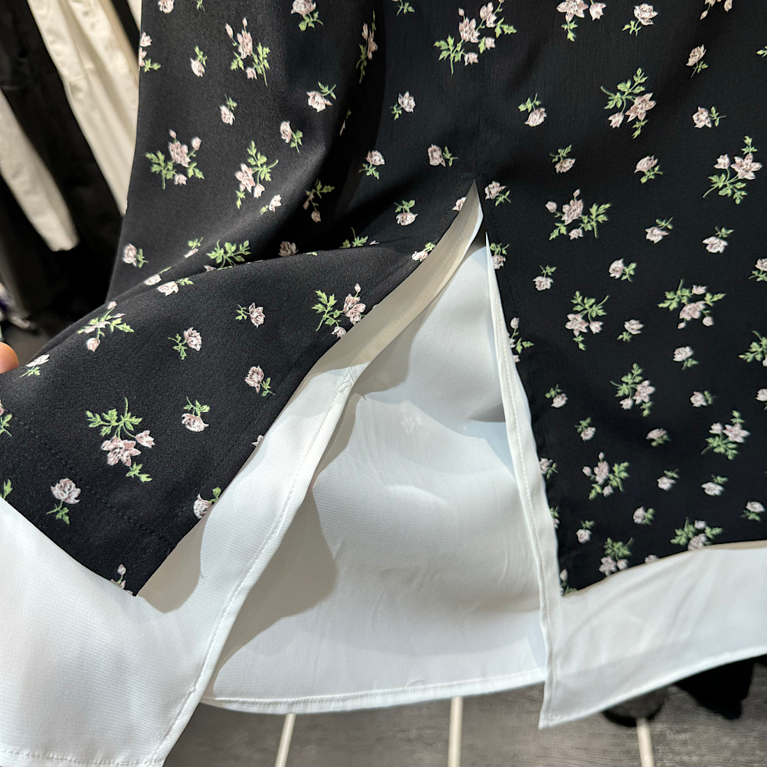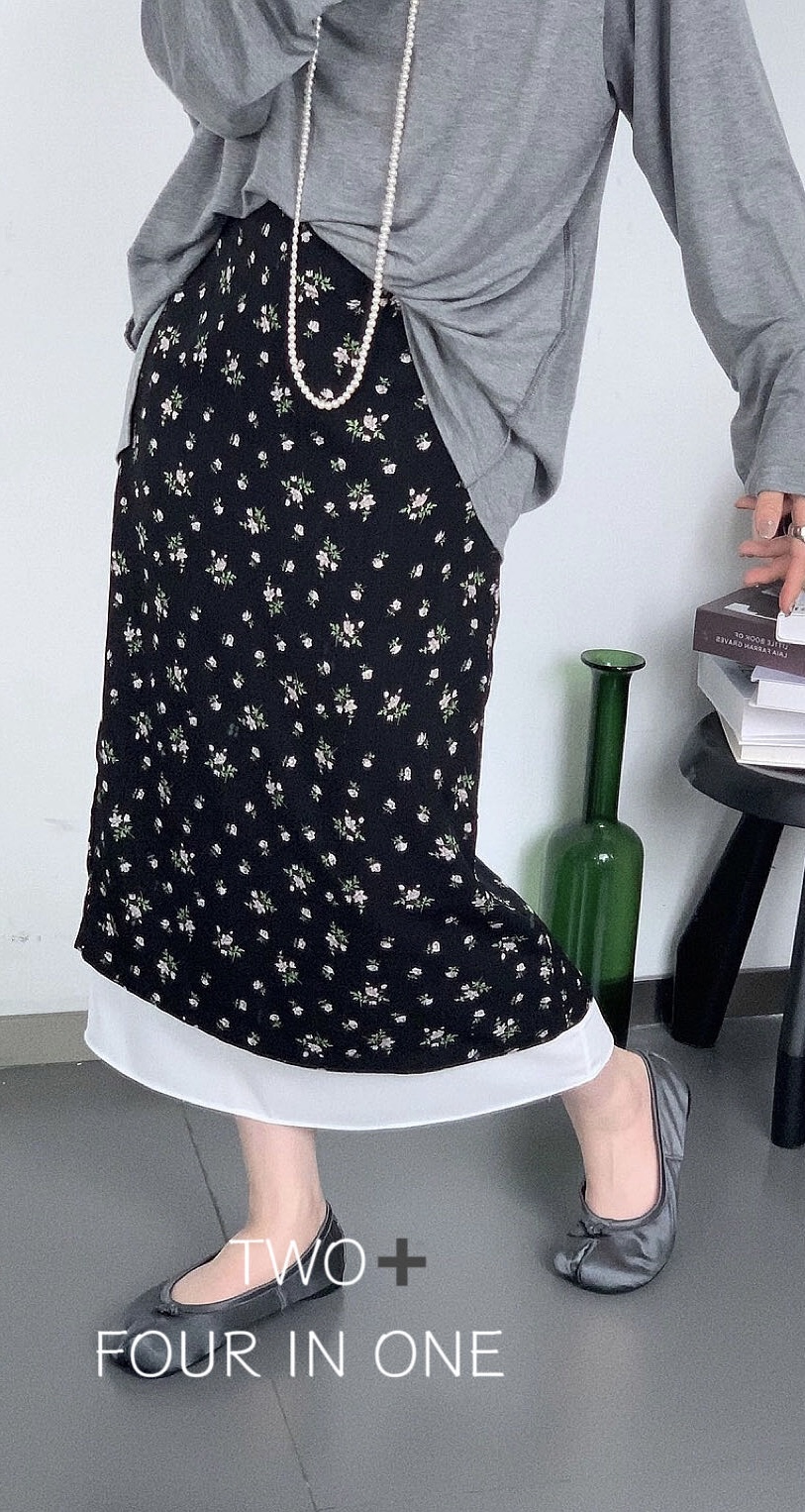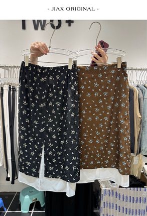 FOUR 2024春夏新款复古碎花拼接假两件后开叉半身裙女韩版中长裙