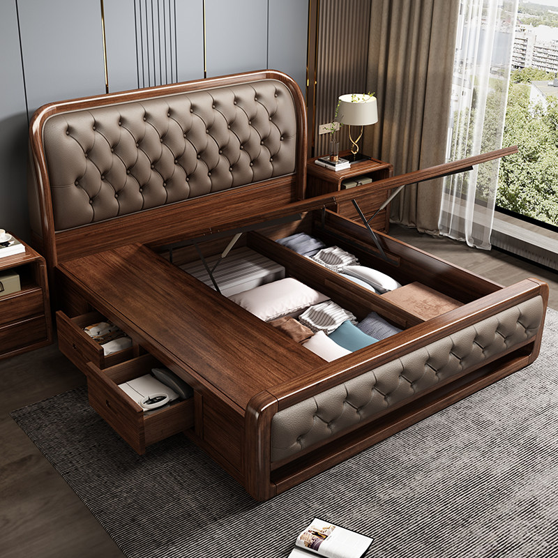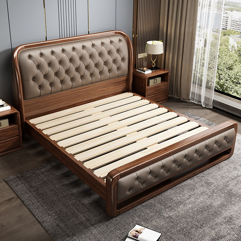 源氏木语实木床胡桃木真皮软包床现代简约双人大床轻奢主卧高箱新