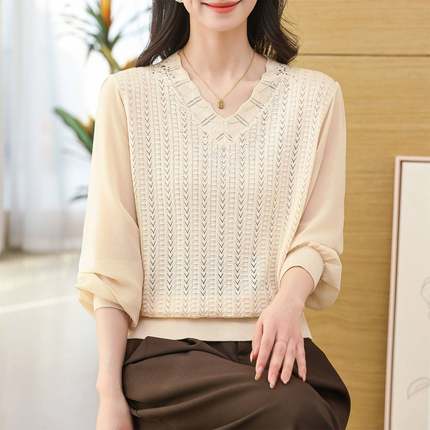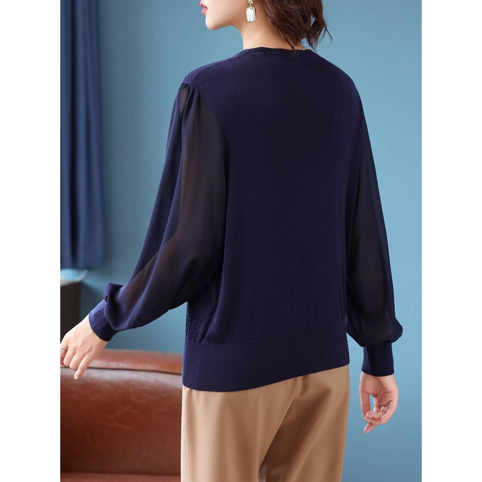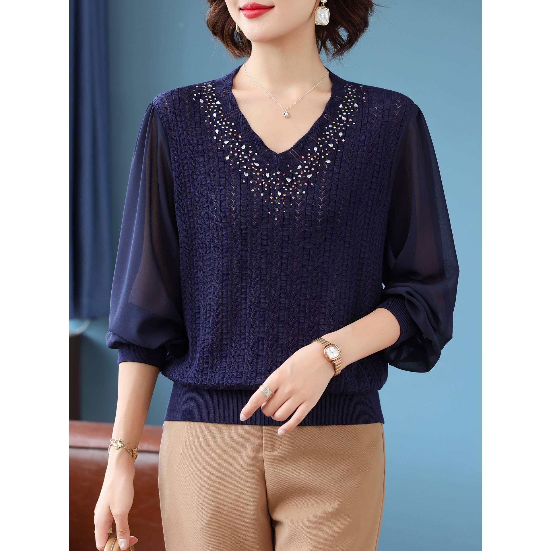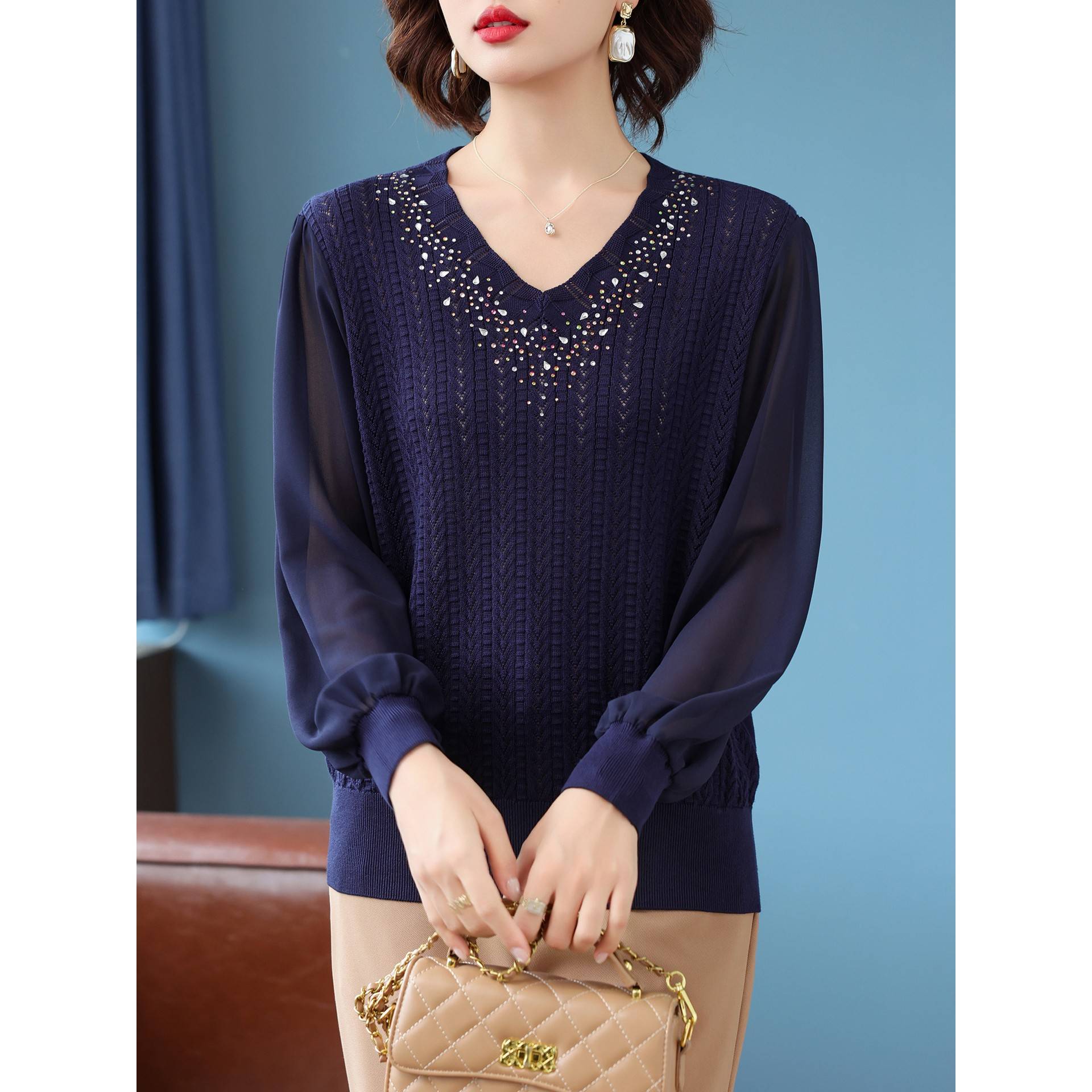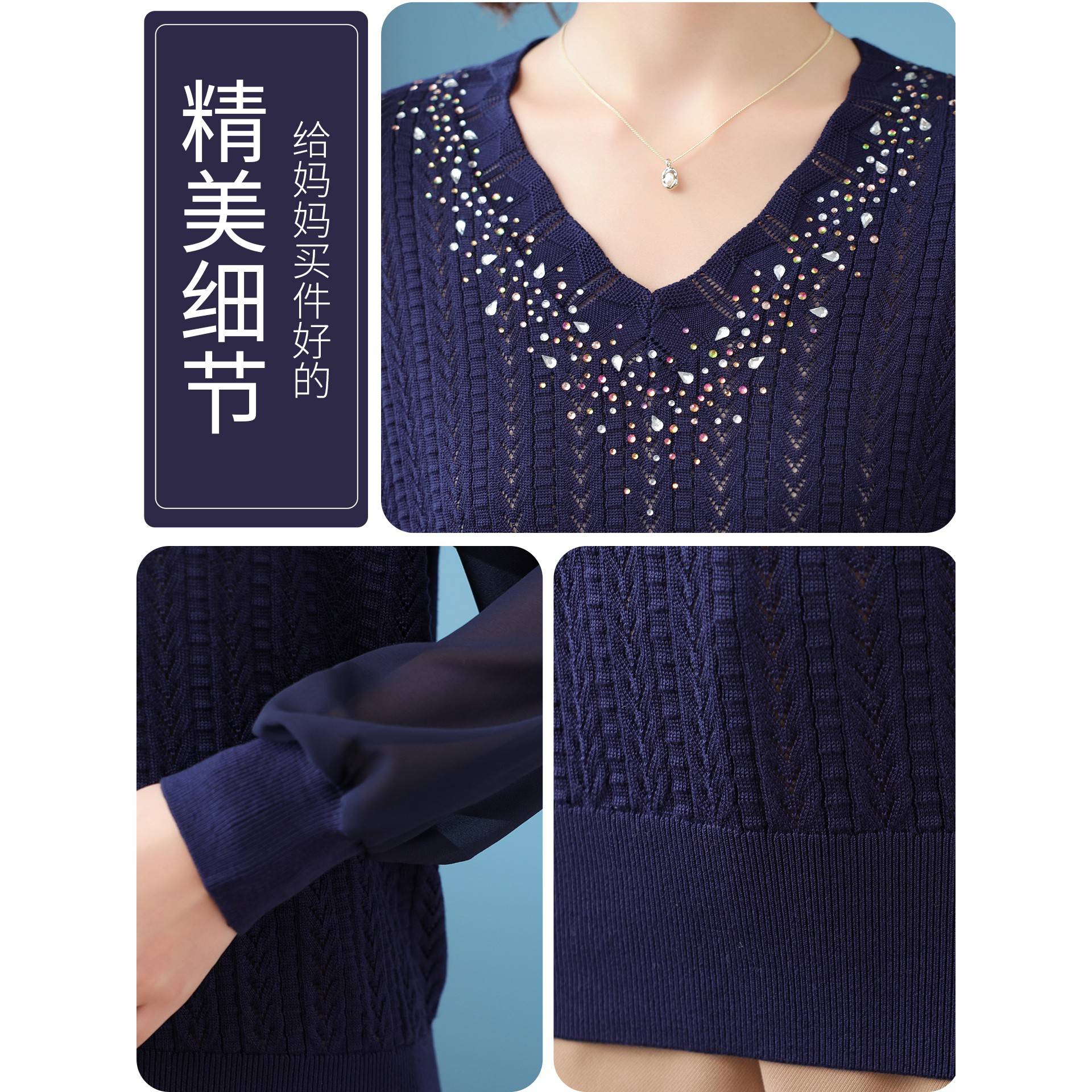 妈妈洋气雪纺长袖T恤中年女装春秋装打底小衫中老年小码针织上衣