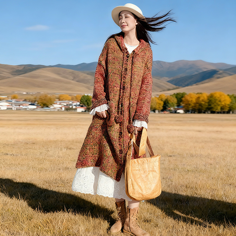 【织织不倦】文艺复古针织连帽开衫女秋季中长款宽松休闲毛衣外套