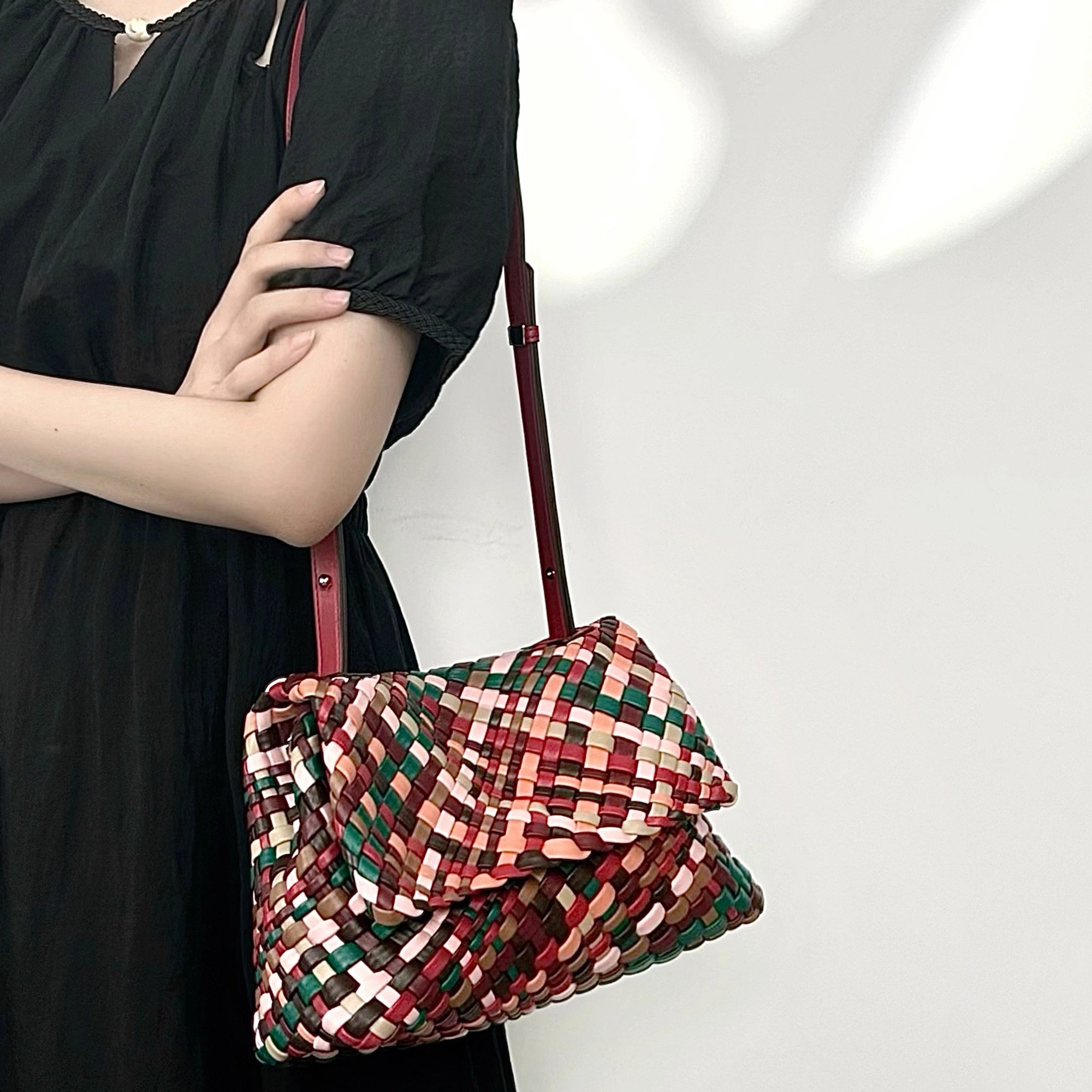 彩虹手工编织邮差包撞色小方包个性小众设计包包腋下单肩包斜挎包