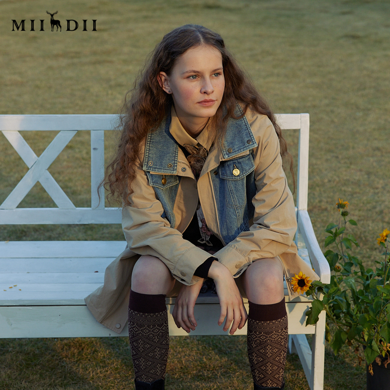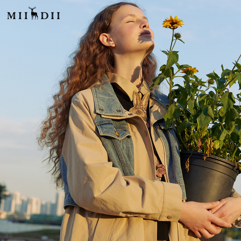 谜底拼接牛仔风衣女春新款复古时尚翻领中长款外套241ME0097