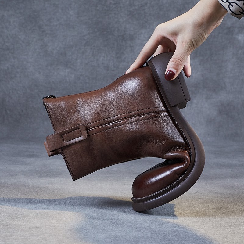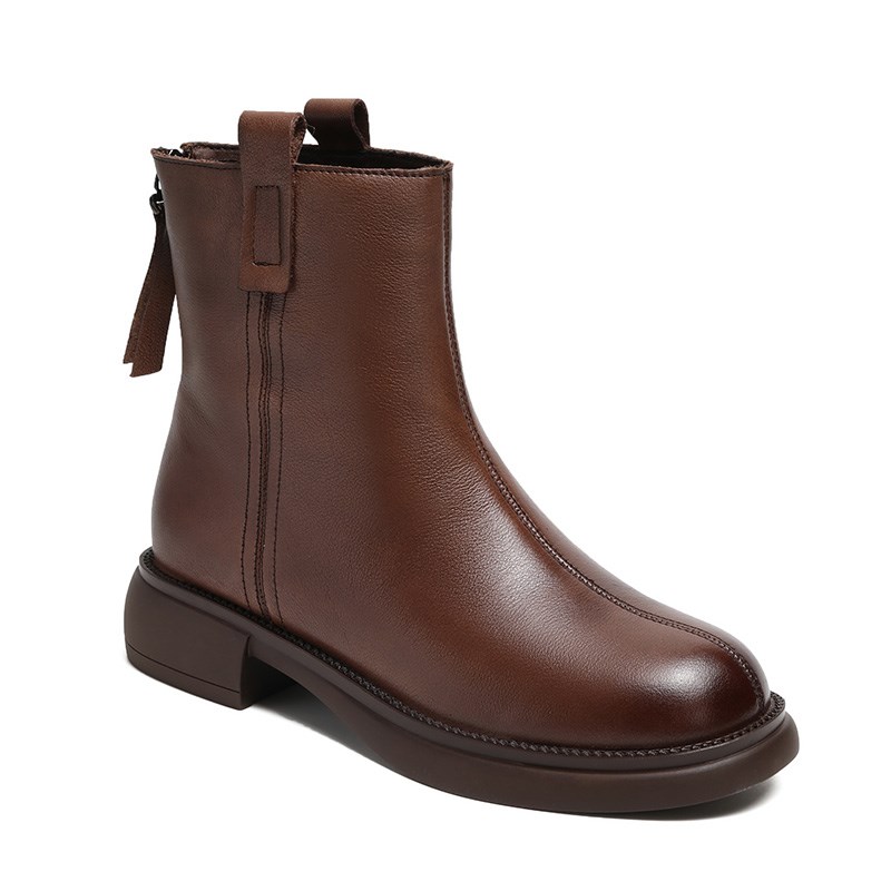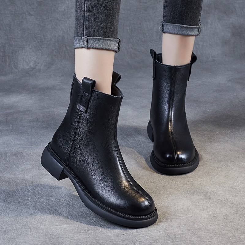 头层牛皮短靴真皮女鞋2024秋冬新款英伦复古粗跟靴W子马丁靴瘦瘦