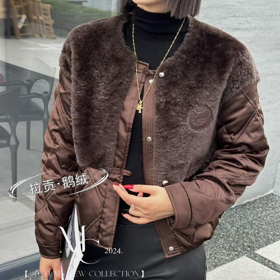 进口南非拉贡皮毛一体鹅绒羽绒服女真皮羊羔毛皮草菱格短外套24冬