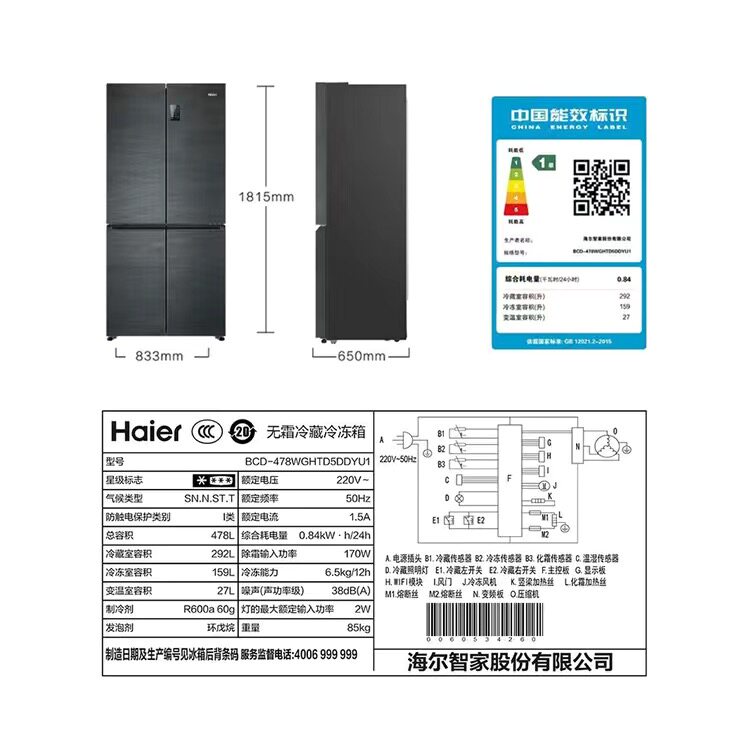 Haier/海尔BCD-478WGHTD5DDYU1变频无霜十字四门智能家用十字冰箱