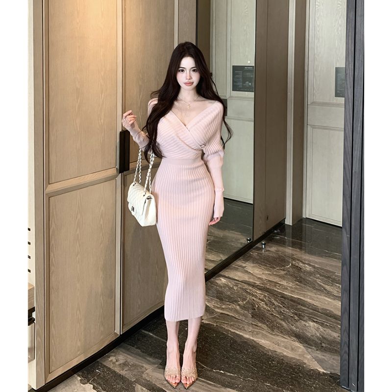 纯欲风甜美粉色V领针织连衣裙女冬季新款小香风收腰气质包臀长裙