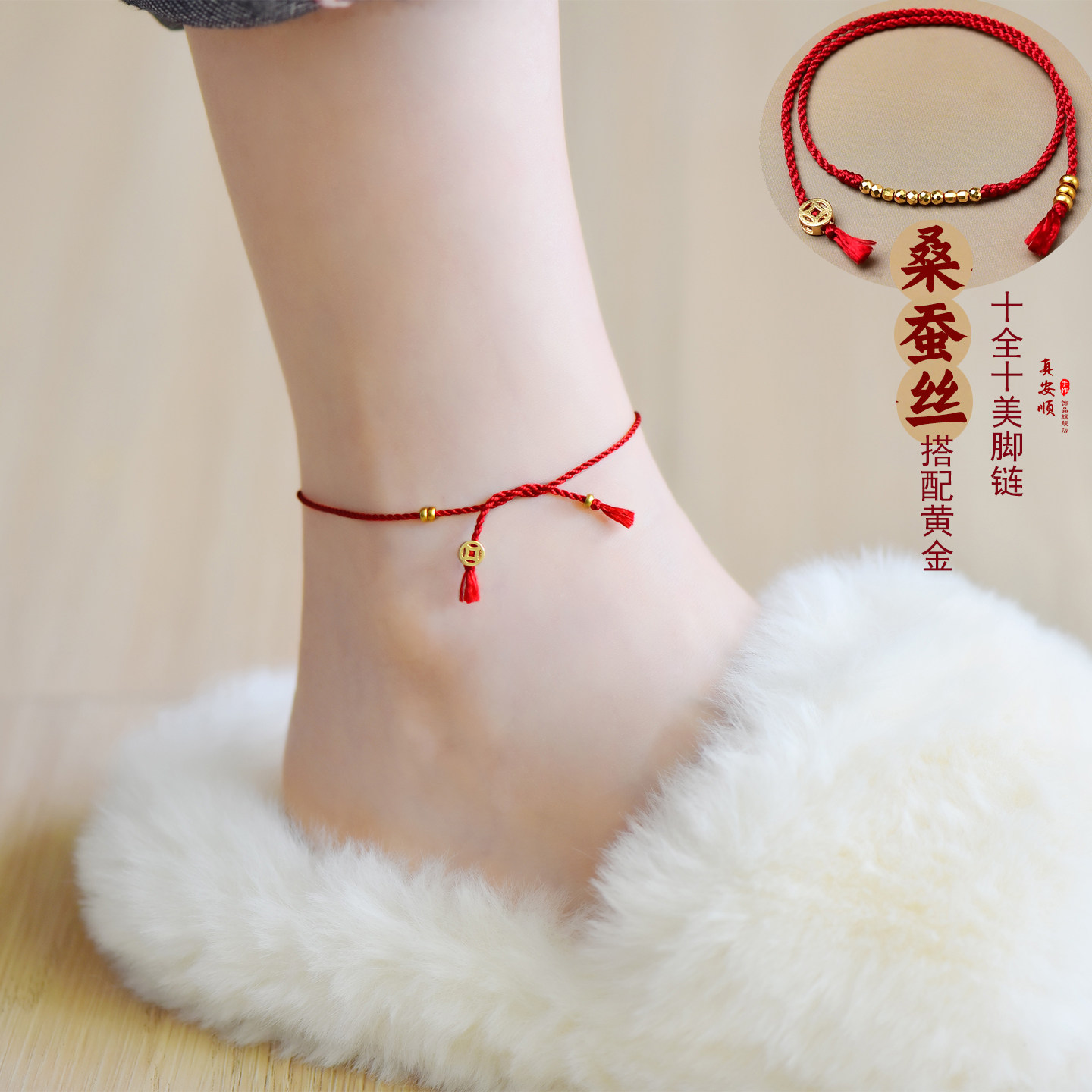 高档999足金红腰带桑蚕丝黄金转运珠本命年红绳脚链手链真丝送礼