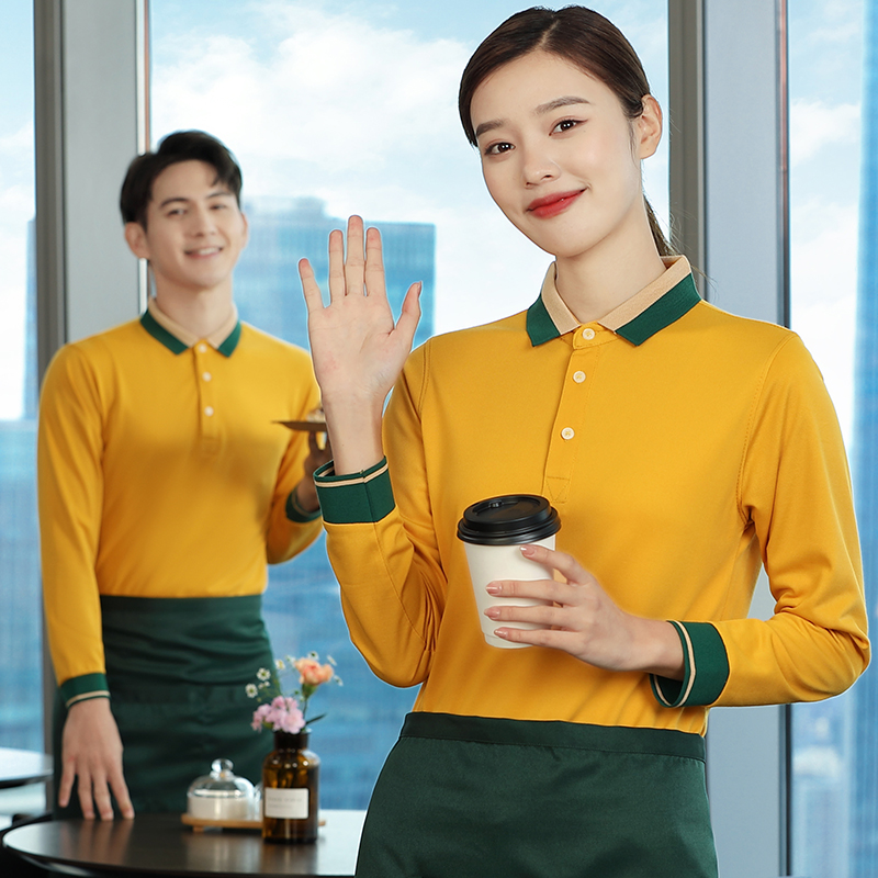 新款工作服翻领t恤长袖餐厅餐饮火锅饭店奶茶店服务员女定制logo