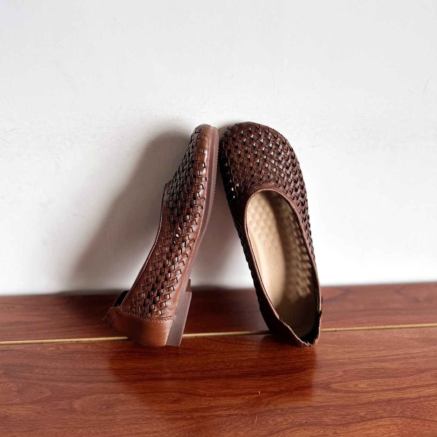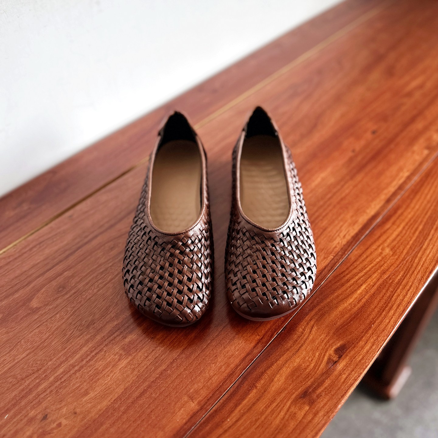 【烁掌柜】复古做旧手工真皮女鞋头层编织牛皮低跟圆头浅口鞋单鞋