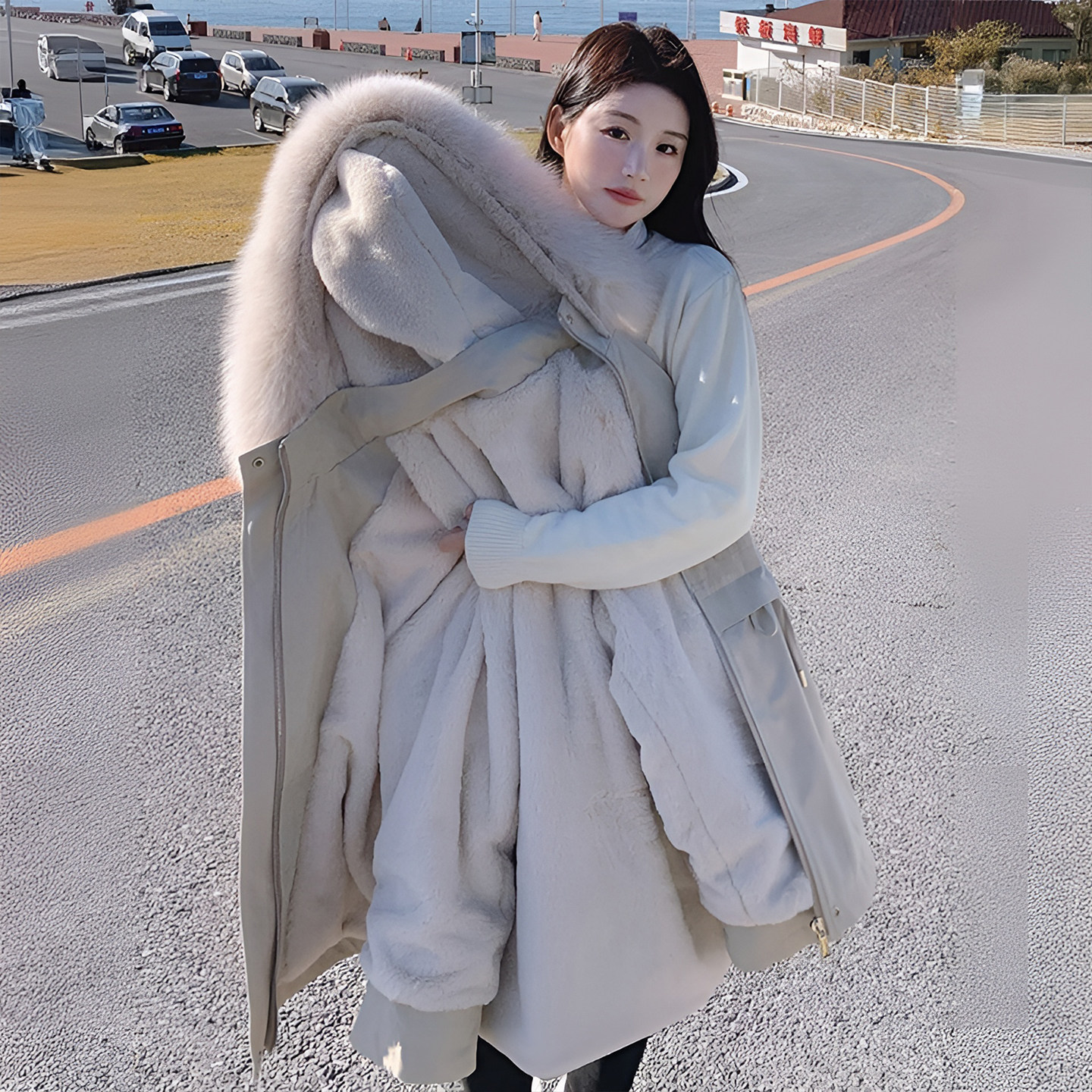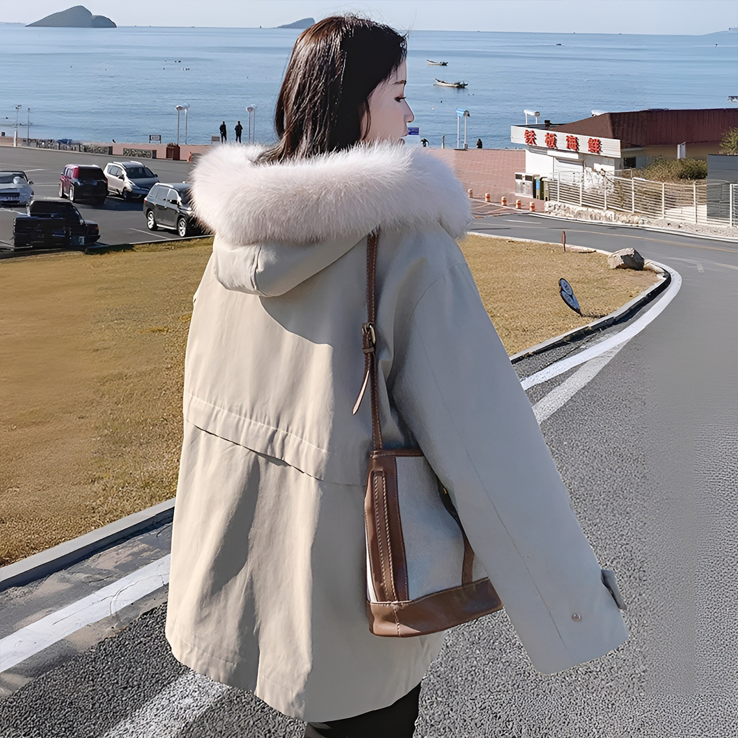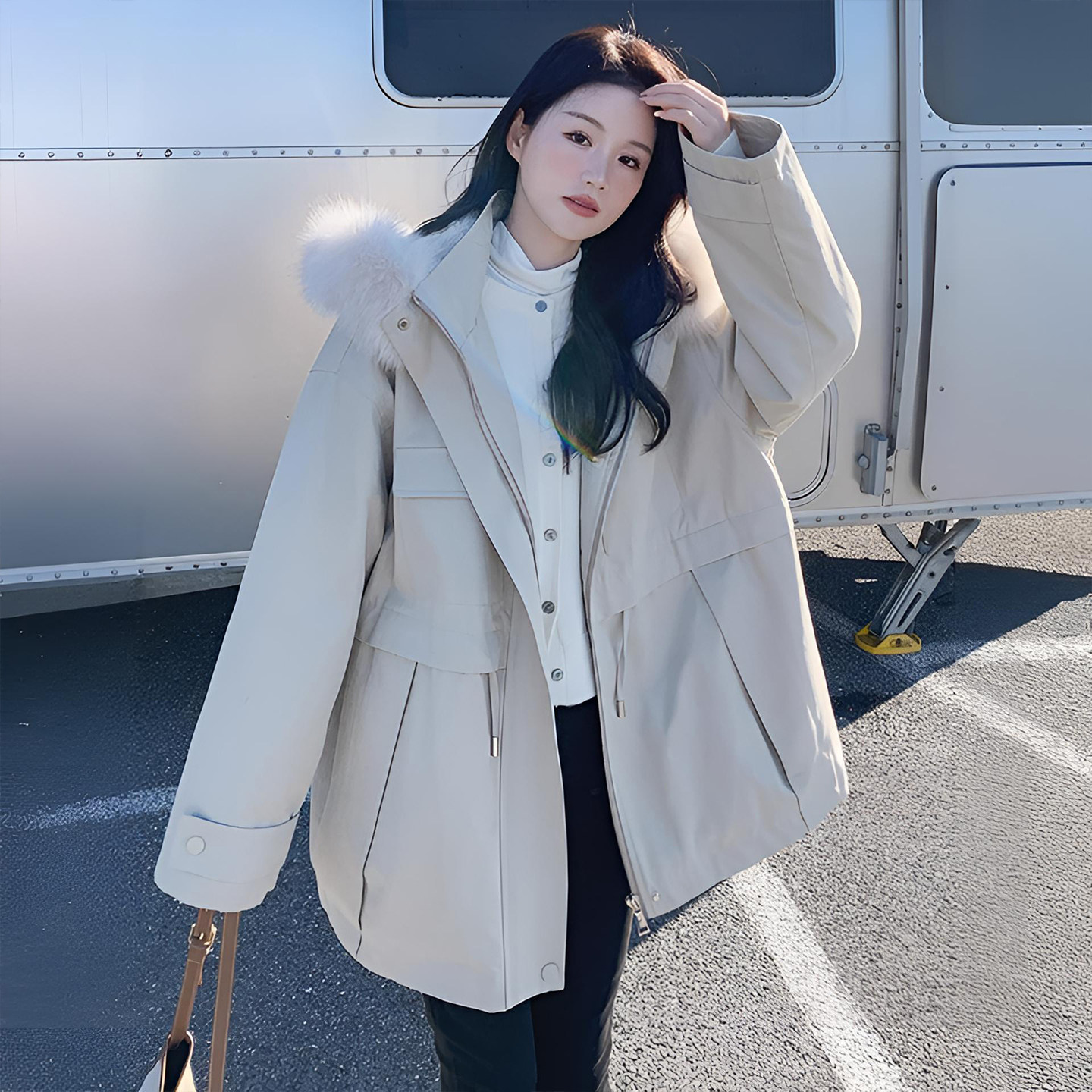 胖mm大码女装米白色收腰显瘦派克棉服女冬季加厚保暖连帽棉衣外套