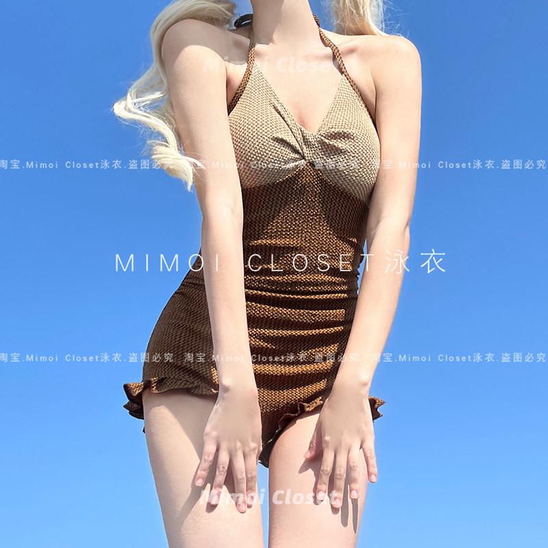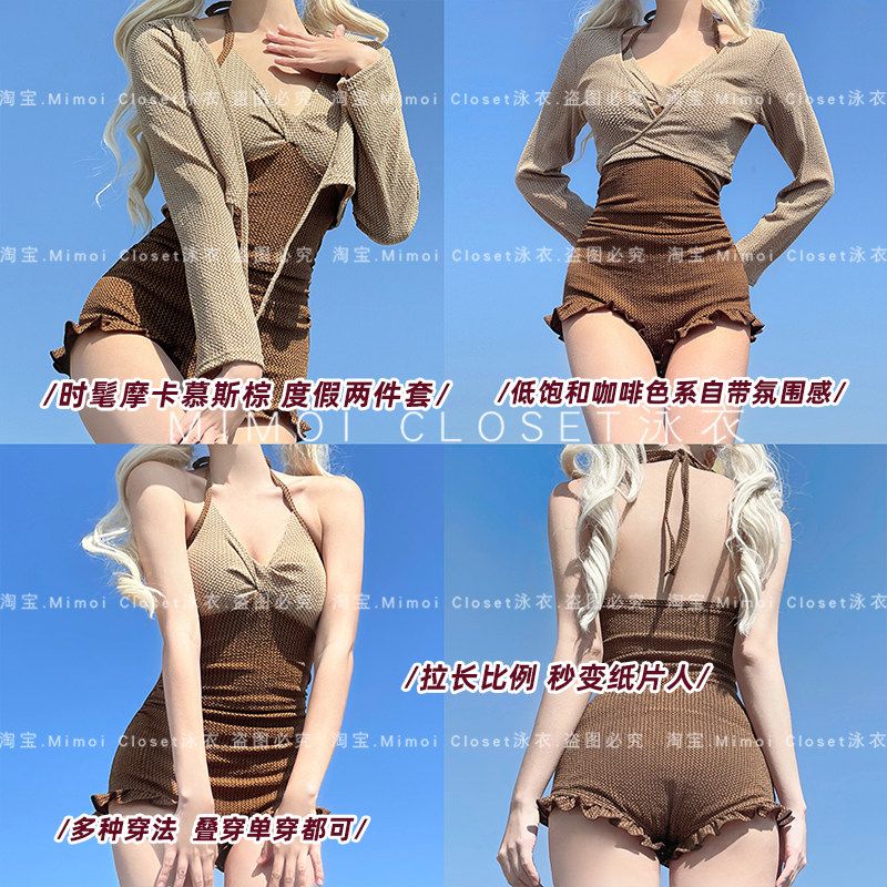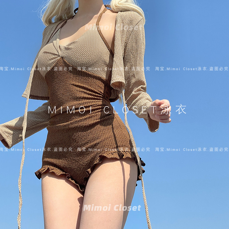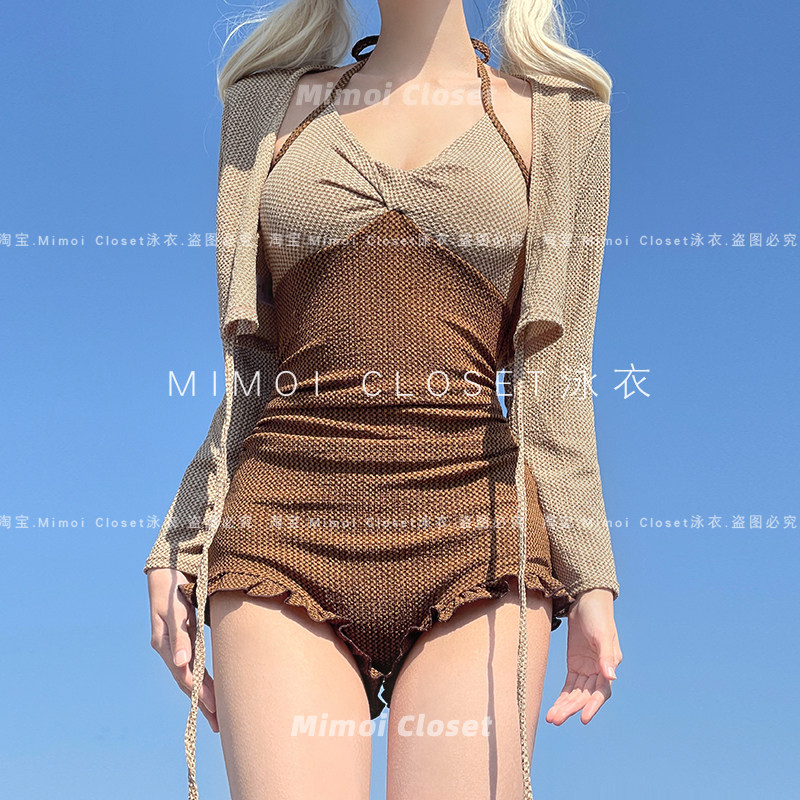 Mimoi Closet新款【摩卡咖啡】长袖罩衫两件套高级连体游泳衣女款