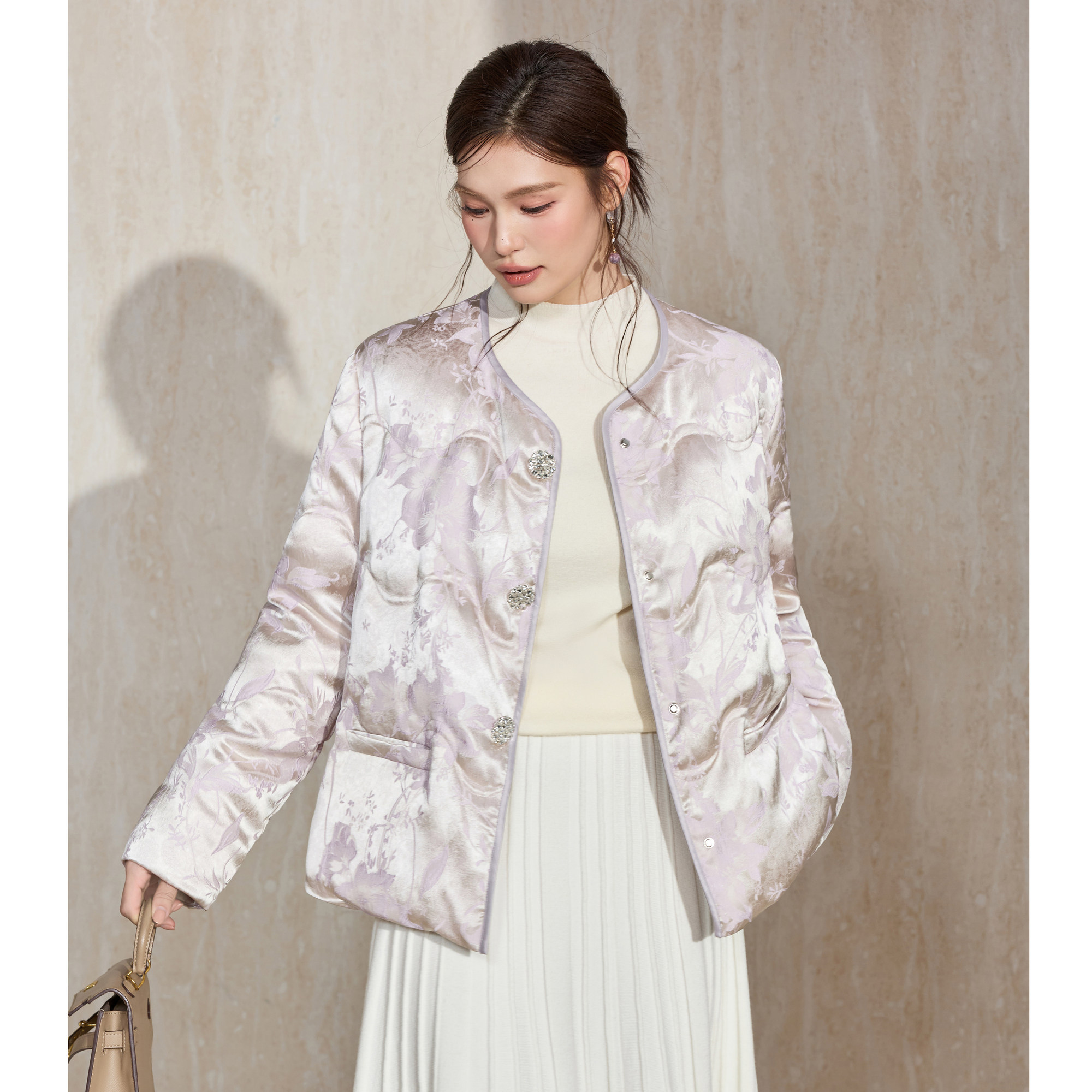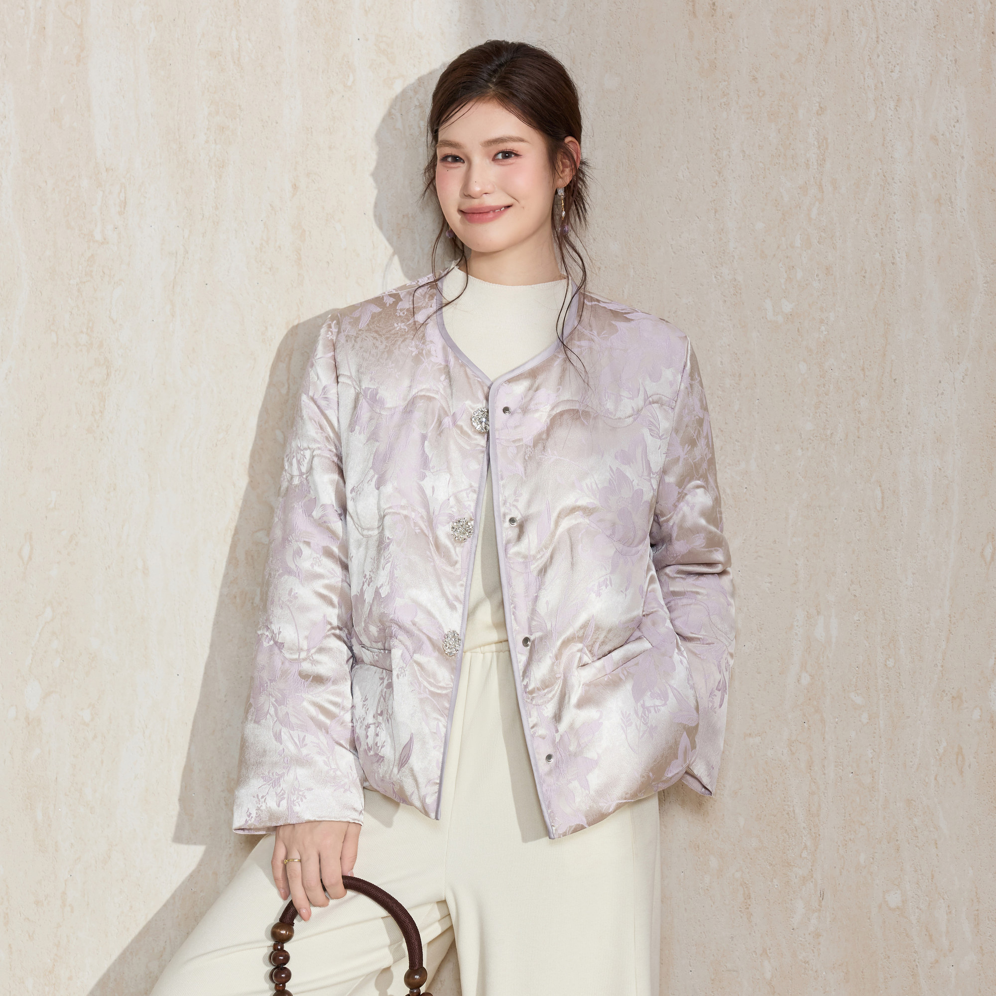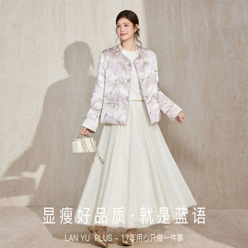 蓝语大码新中式缎面提花羽绒服外套女2025冬季新款微胖MM国风上衣