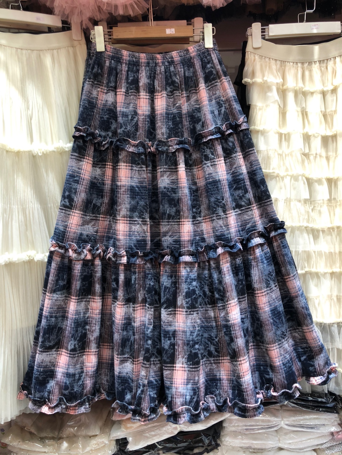 甜美减龄扎染印花格纹半身裙女秋冬荷叶边蛋糕裙垂感显瘦A字长裙