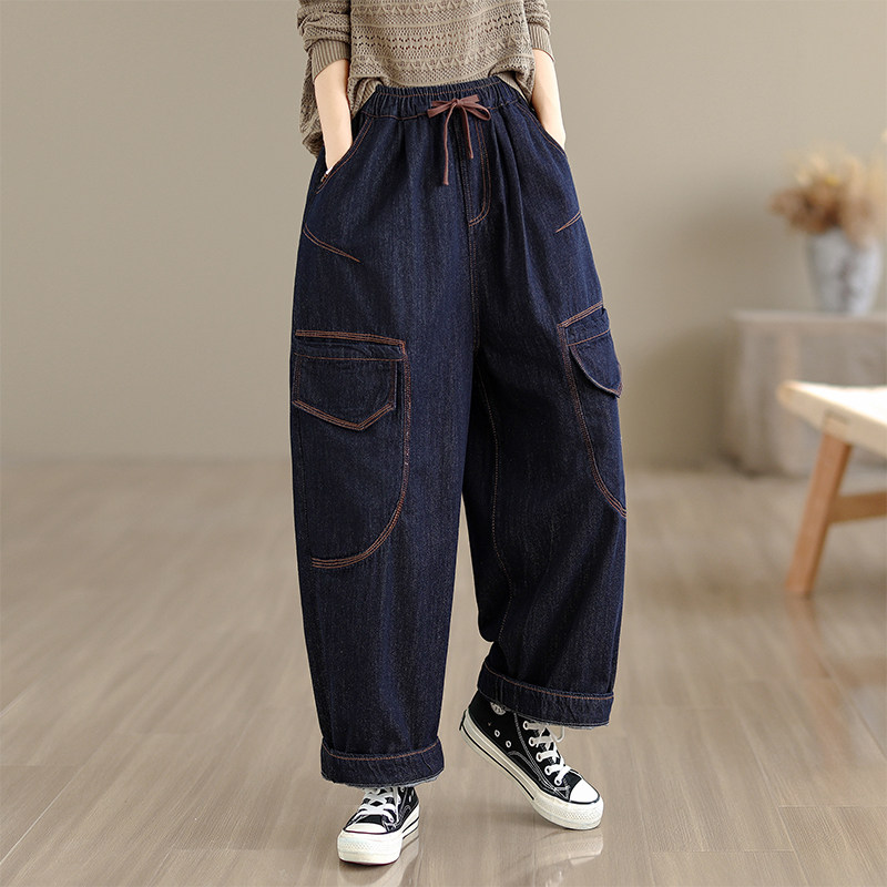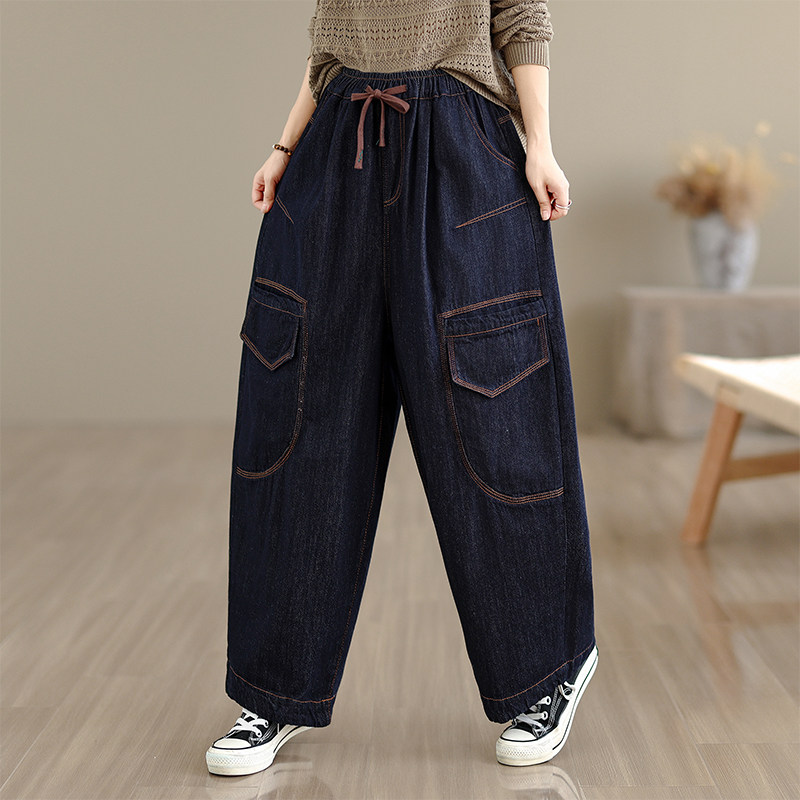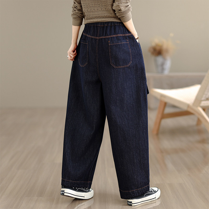 春秋季新款牛仔水洗休闲大码松紧腰 九分哈伦裤女蓝色薄款显瘦