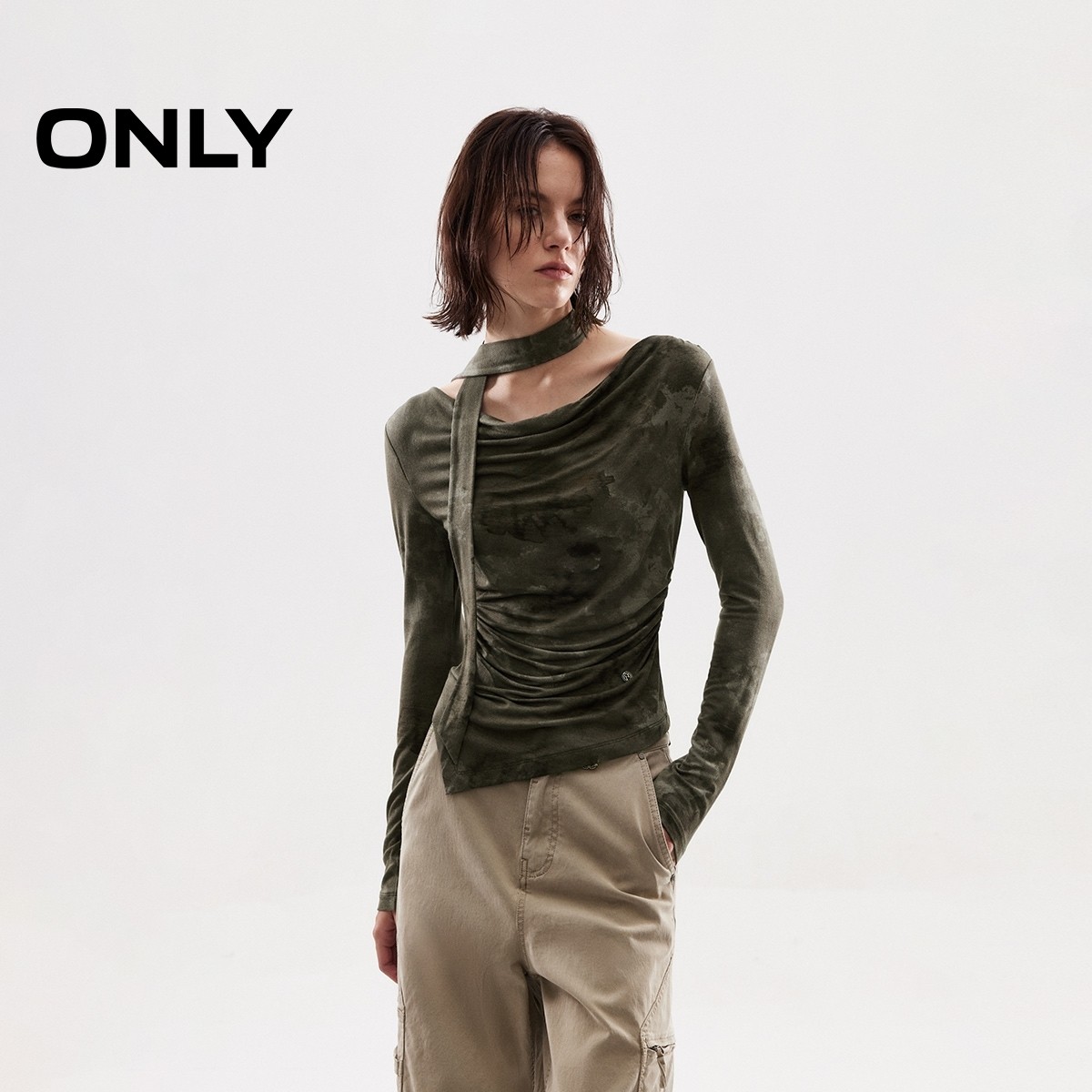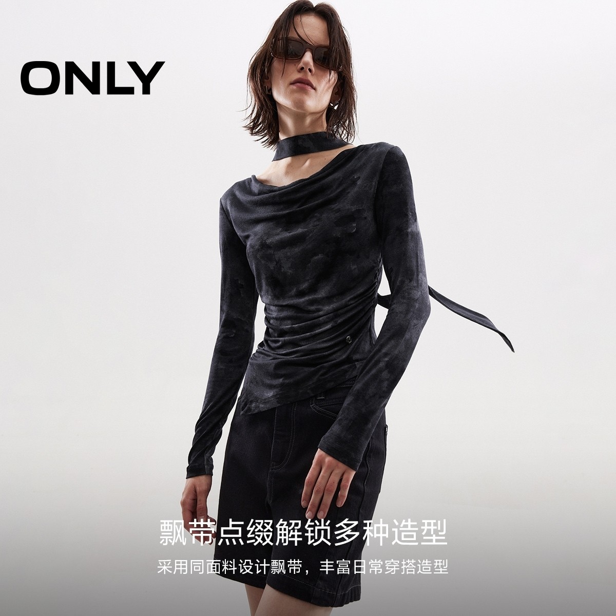 ONLY2025秋冬新款优雅荡领个性修身纯色飘带腰身捏褶长袖T恤女