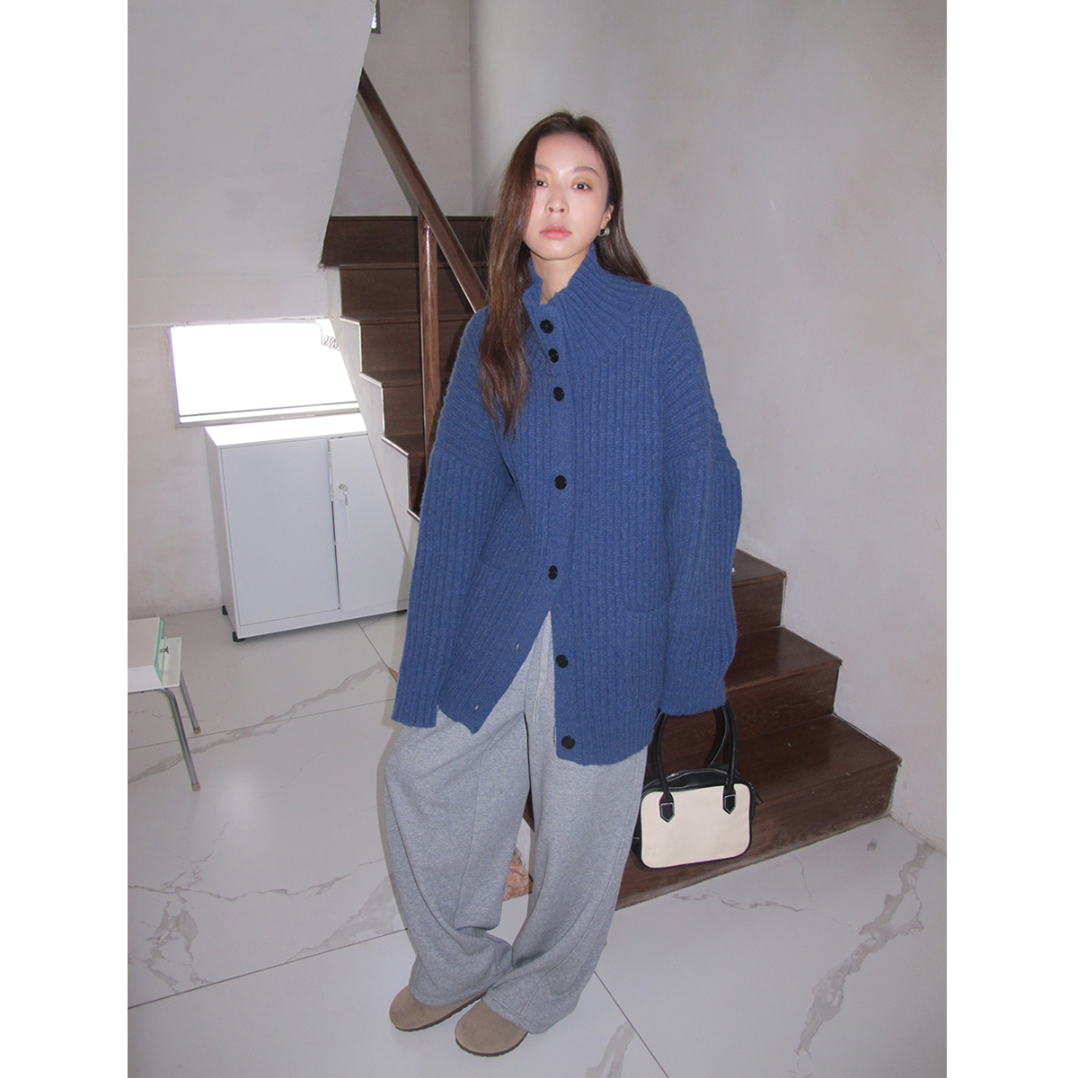 SIXI四喜 暮色晚风 蓝色高领毛衣外套女秋冬慵懒加厚针织衫开衫