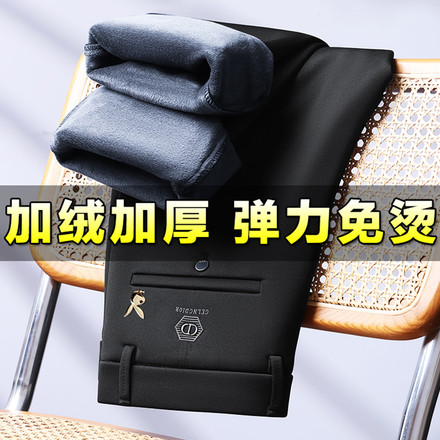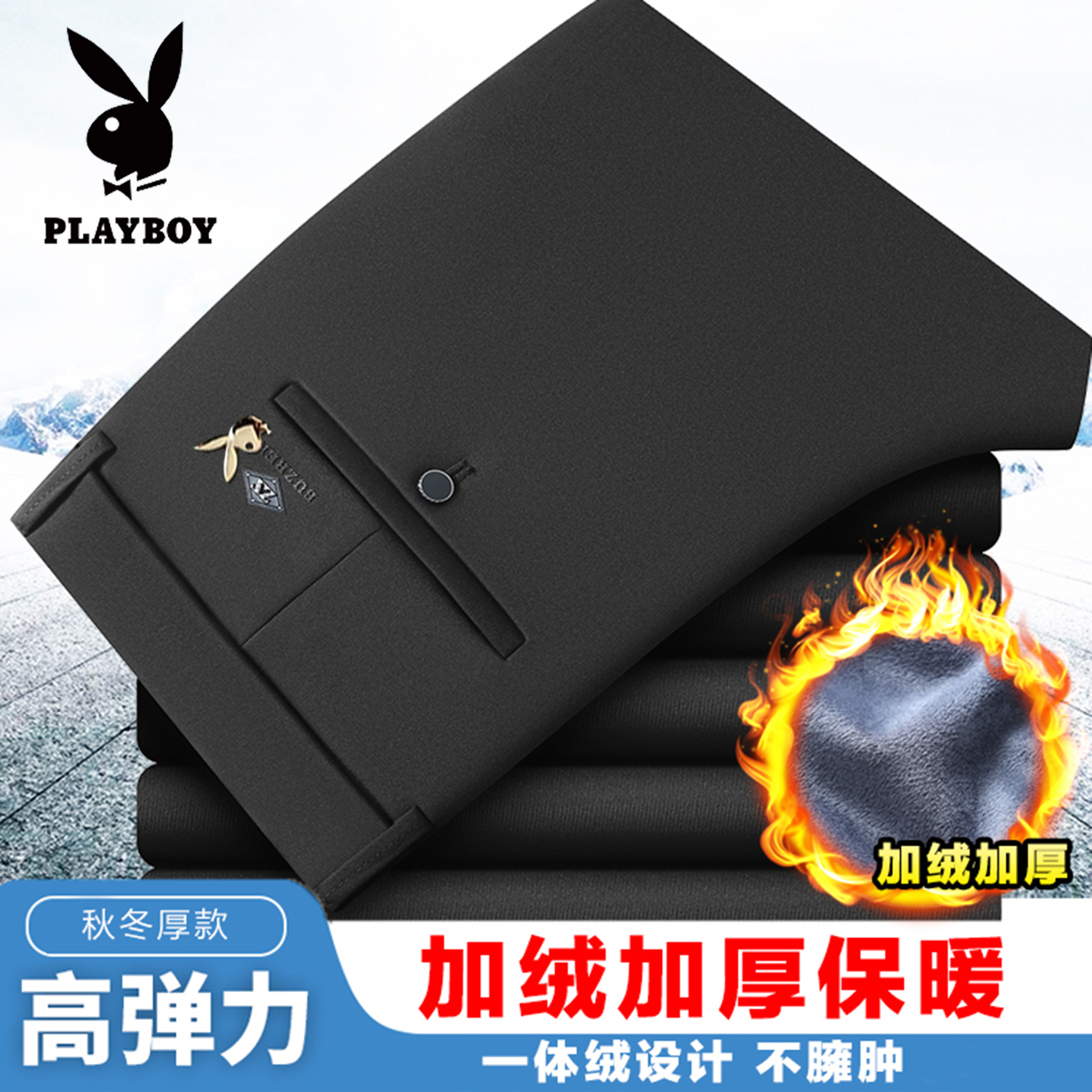 花花公子秋冬厚款男士休闲裤加绒加厚男长裤直筒弹力中年高腰裤子