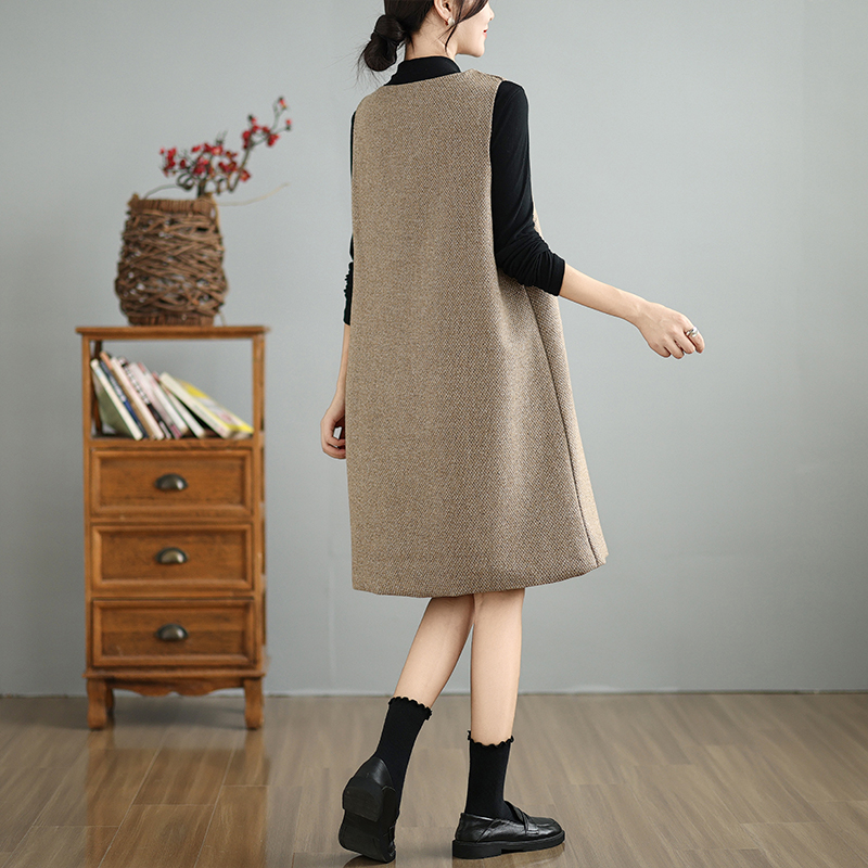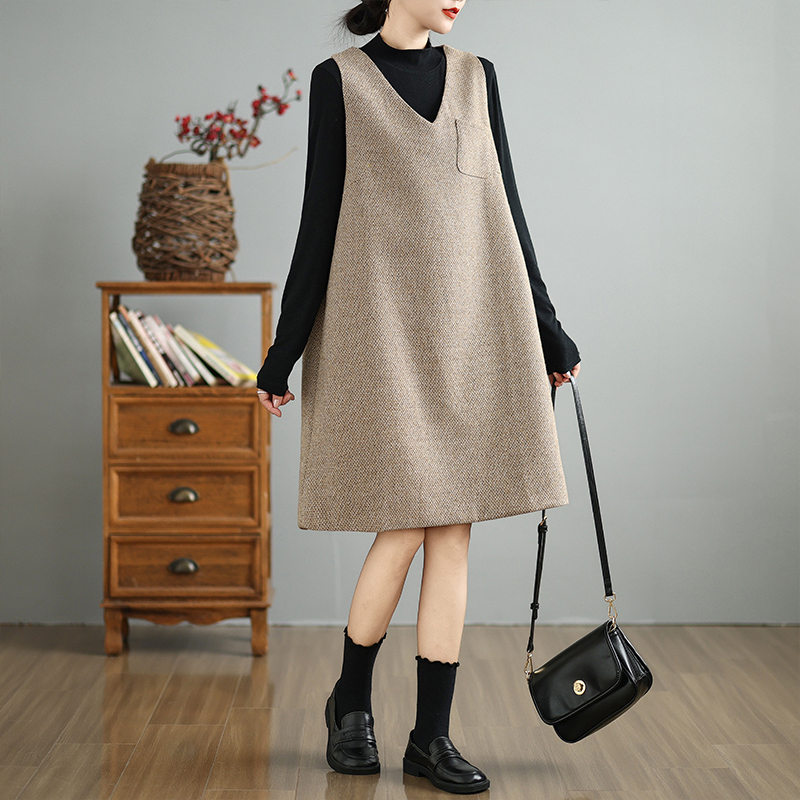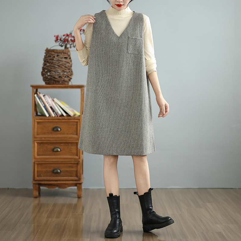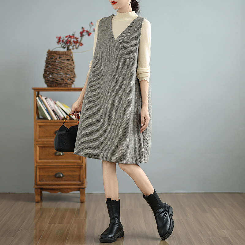 灰色毛呢背心高端连衣裙2024秋冬新款V领无袖中长款外穿马甲裙女