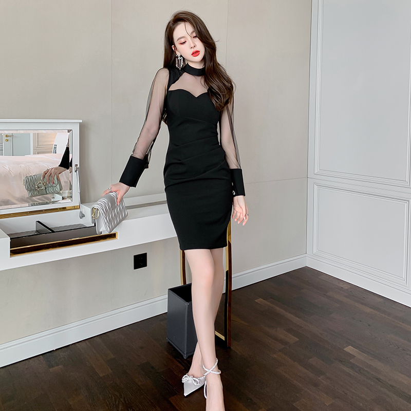法式连衣裙网纱蕾丝拼接小黑裙赫本收腰包臀晚礼服性感妩媚女人味
