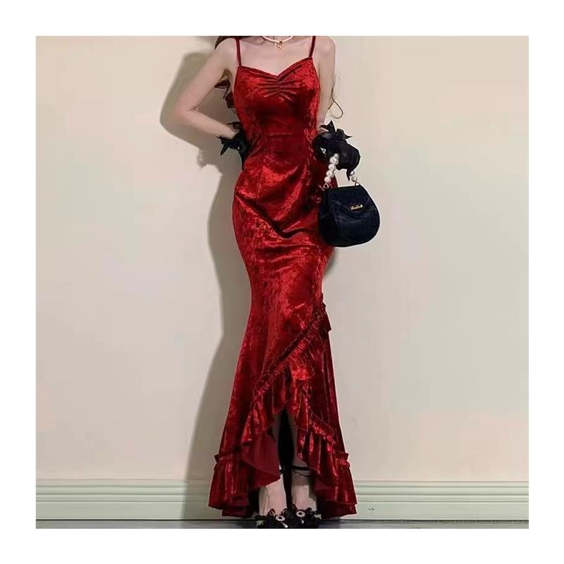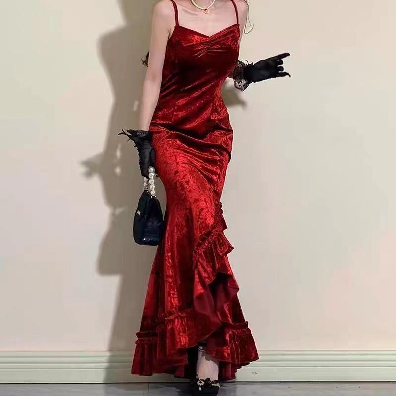 法式纯欲风长裙女春季2025新款宫廷红色晚礼服气质长款吊带连衣裙