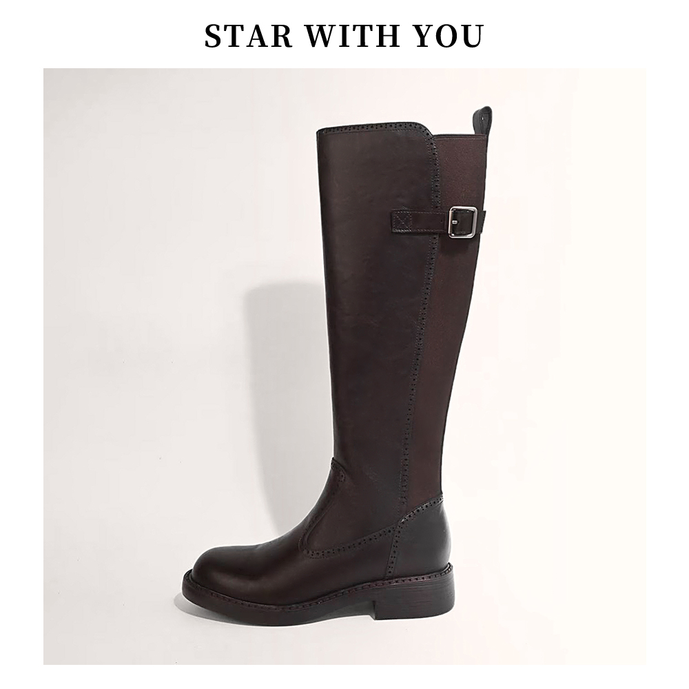 【STAR】显瘦英伦风皮带扣复古圆头百搭不过膝拼接长筒靴3.5cm