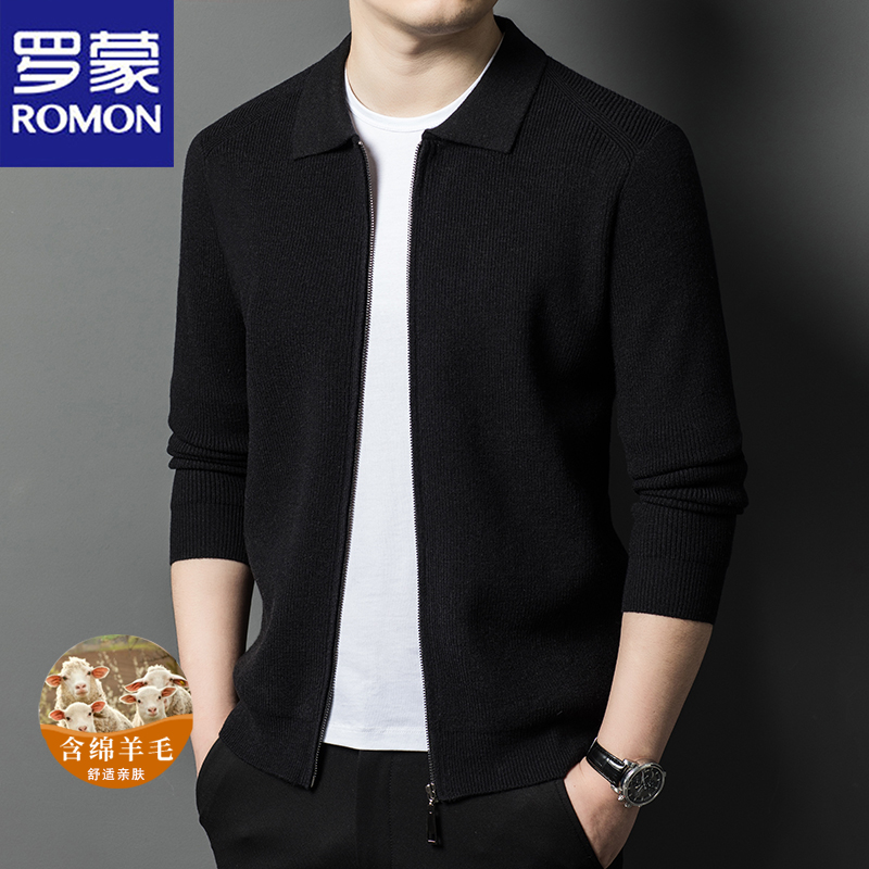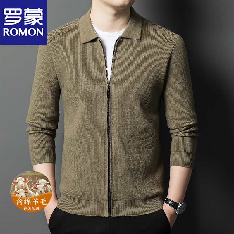 罗蒙2025春秋季新款男士高端绵羊毛开衫中年拉链翻领百搭针织外套