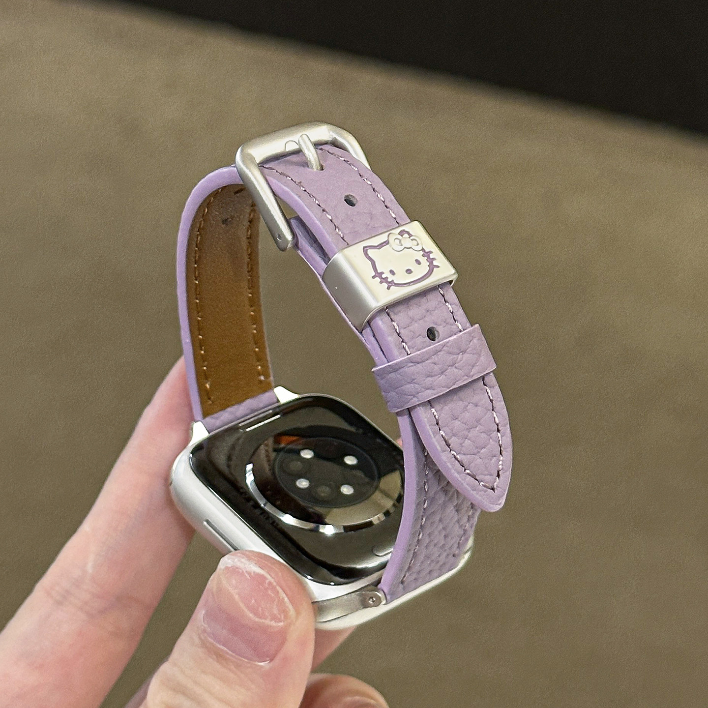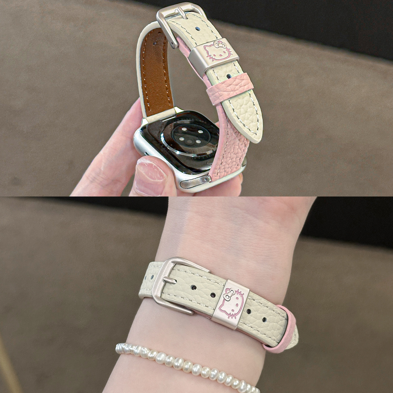 适用苹果手表拼色KT猫荔枝纹细款真皮表带applewatchS11/10/9/8/7质感金属扣iWatchSE秋冬柔软小蛮腰皮腕带女