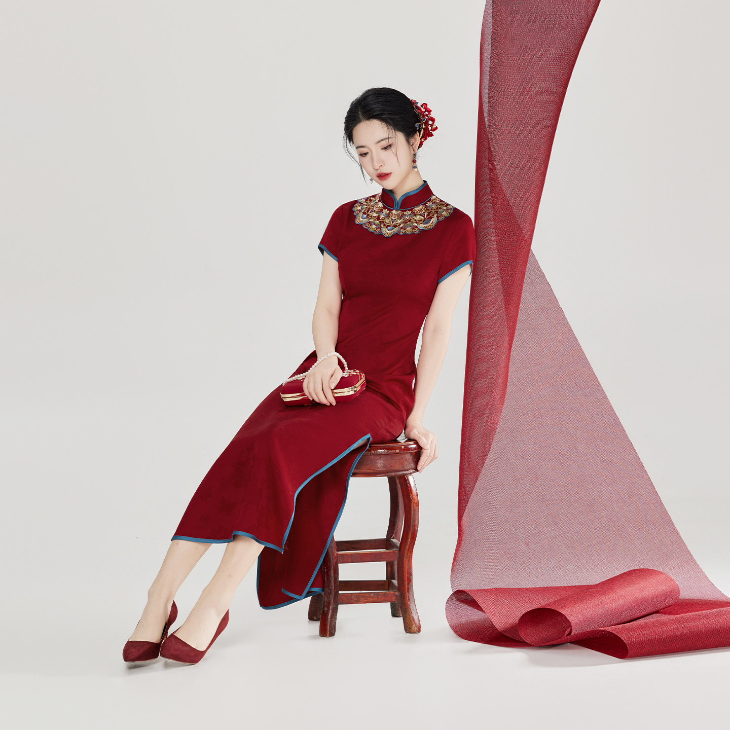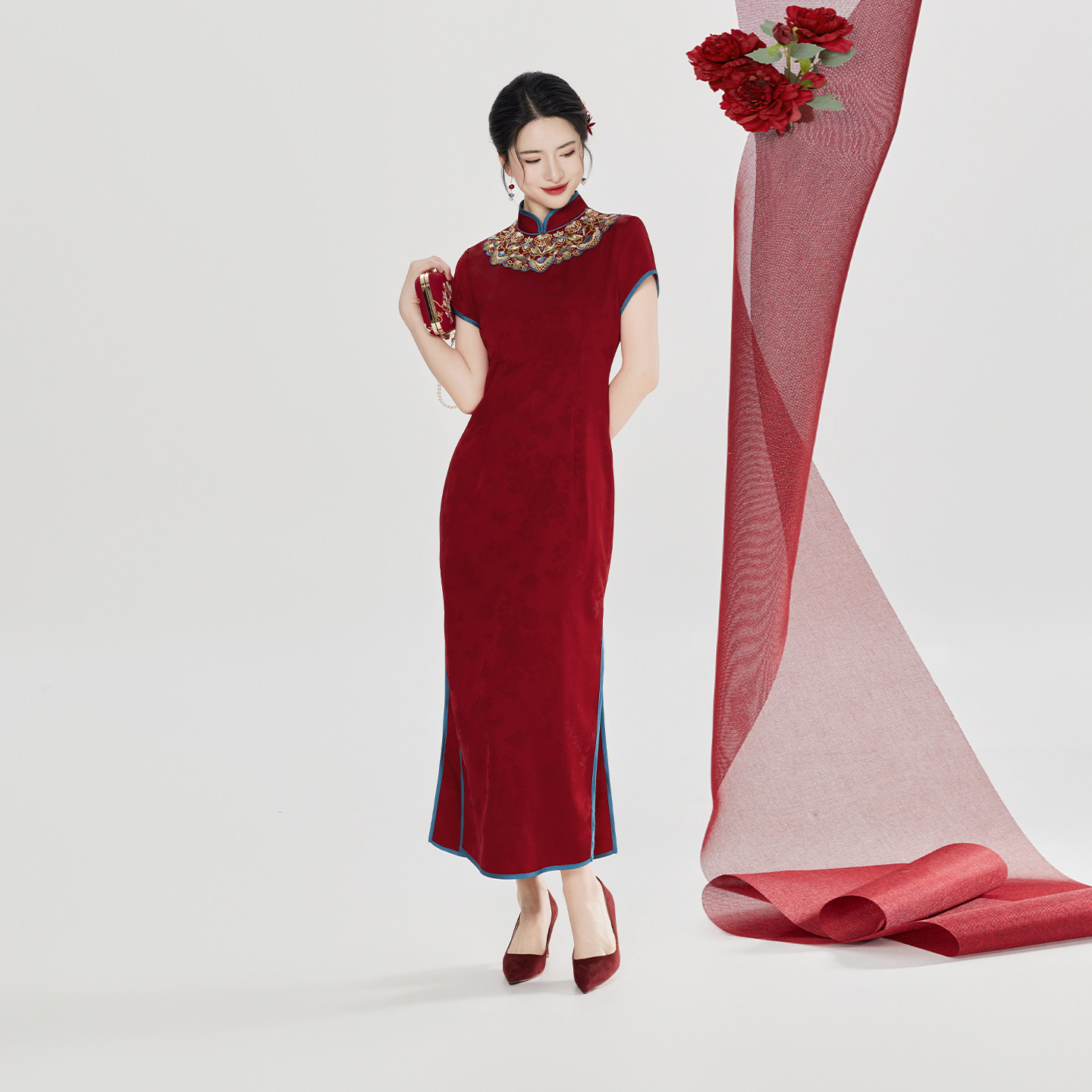 织造司[红琉璃]新中式红色旗袍连衣裙新娘服婚礼服日常可穿连身裙