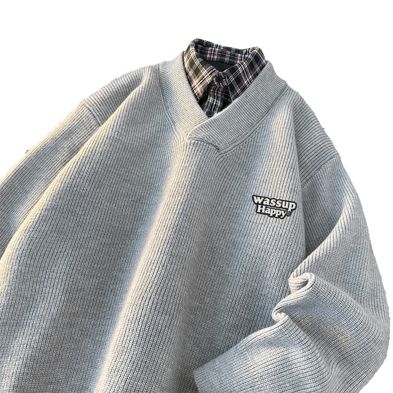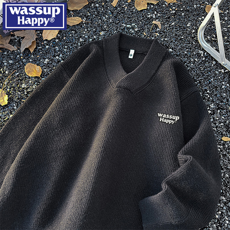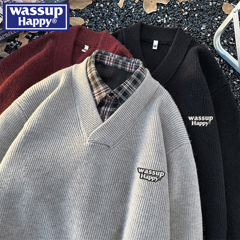 wassup happy复古V领毛衣男冬季宽松保暖内搭针织衫情侣休闲线衣