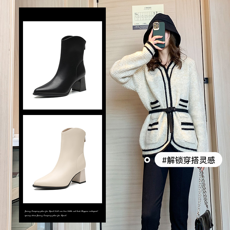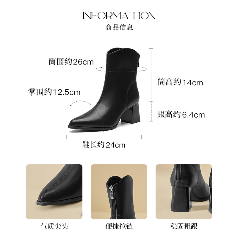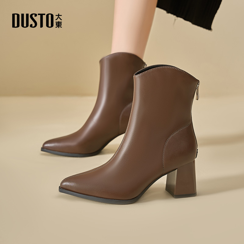 大东2025冬季新款女鞋时尚优雅时装靴尖头后拉链粗跟高跟中筒女靴